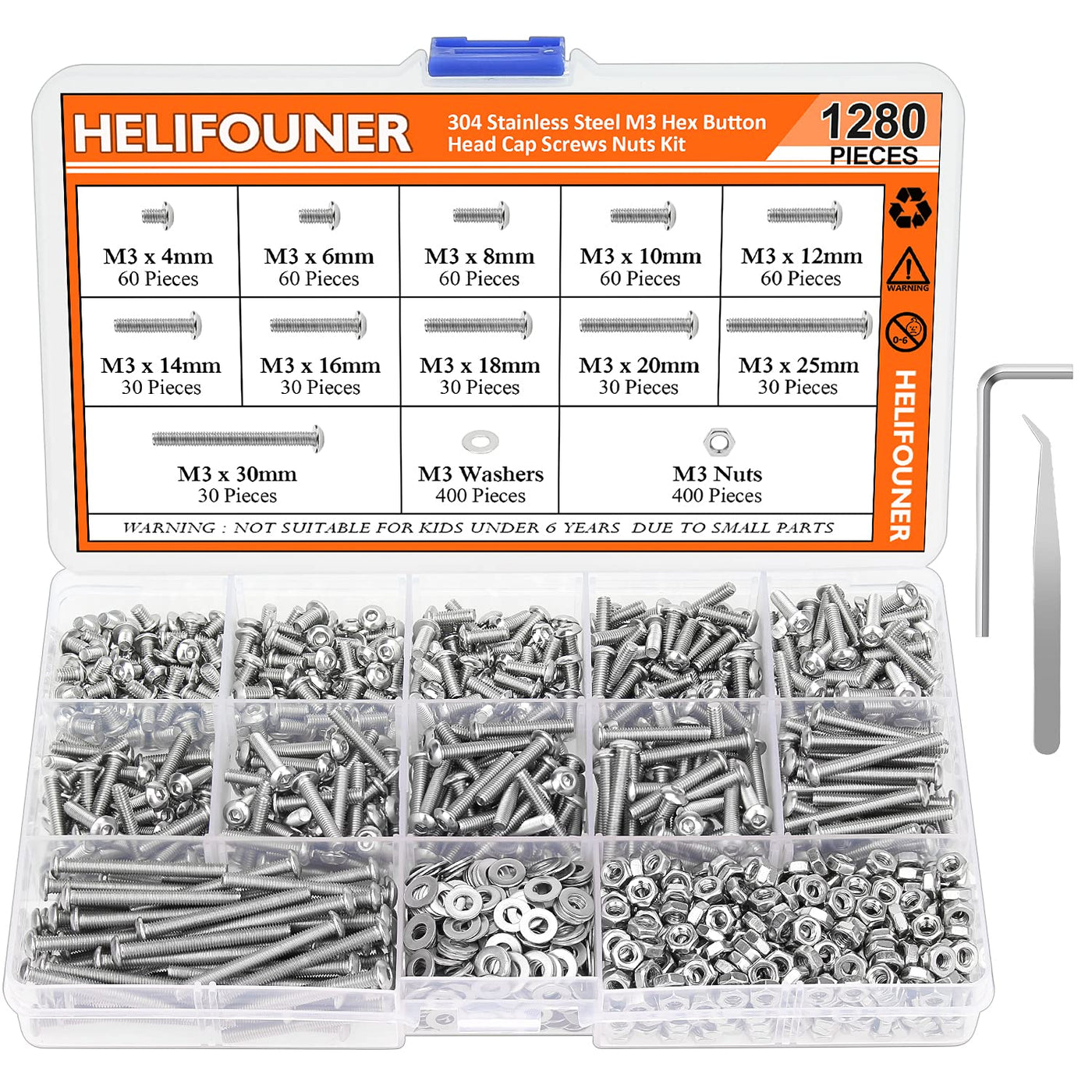 【Specifications:】 - Size: M3 - Color: Silver - Drive Type: Internal Hex - Material: 304 Stainless Steel - Package Quantity: 1280 Pieces - Screws Type: Hex Button Head Screws 【Features:】 - 304 stainless steel, high hardness, no deformation, anti-oxidation, corrosion resistance. - The nuts and flat washers expand the contact area and reduce the pressure in order to protect the screws and parts. - Compact and force uniform screw thread is not easy to out of shape and slid in the process of rolling and installation. - Widely used in automotive, boating, printed projects home appliance, communication equipment and other machinery industry. 【Package Included:】 <1> M3x4mm --------- 60Pieces <2> M3x6mm --------- 60Pieces <3> M3x8mm --------- 60Pieces <4> M3x10mm -------- 60Pieces <5> M3x12mm -------- 60Pieces <6> M3x14mm -------- 30Pieces <7> M3x16mm -------- 30Pieces <8> M3x18mm -------- 30Pieces <9> M3x20mm -------- 30Pieces <10> M3x25mm ------- 30Pieces <11> M3x30mm ------- 30Pieces <12> M3 Nuts --------- 400Pieces <13> M3 Washers ---- 400Pieces <14> Tweezers---------1 Pieces <15> Hex Wrench------1 Pieces 【Package Quantity: 1280 Pieces M3 Hex Button Cap Screws, Flat Washers and Nuts】 CHOKING HAZARD -- Small parts. Not for children under 6 years. Note: 1, Warning: small parts, keep away from children and kids. 2, If you have any questions, please feel free to contact us at any time.