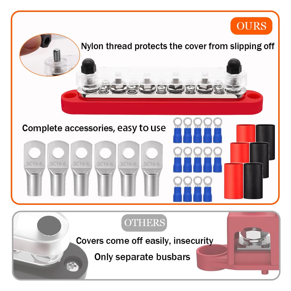 - PACKAGE CONTENT: 1pc positive 12 volt bus bar, 1pc ground 12 volt bus bar, 6pcs 1/4" (M6) terminal studs, 10pcs #8(M4) terminal screws, 14pcs #8 suitable insulated ring terminals and 6pcs copper lugs