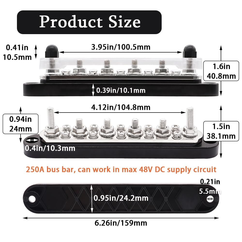 - RANGE FOR USE: This 12V bus bar can handle voltage max 48V DC and continuous current max 250A