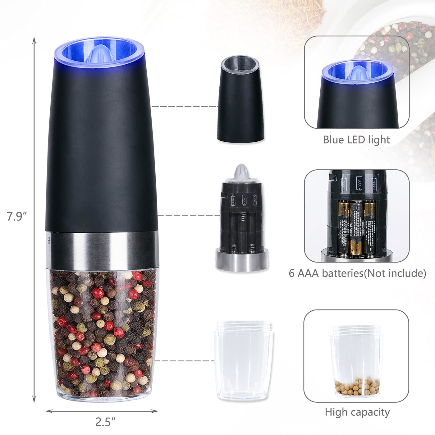 - Unique DesignTransparent acrylic material at the bottom allows you to see the remaining spices and convenient to distinguish the spices in the grinder. With the blue LED light, blue light is not only bright but also gentle, you can easily to see amount of pepper, salt and other grain you put in your food.