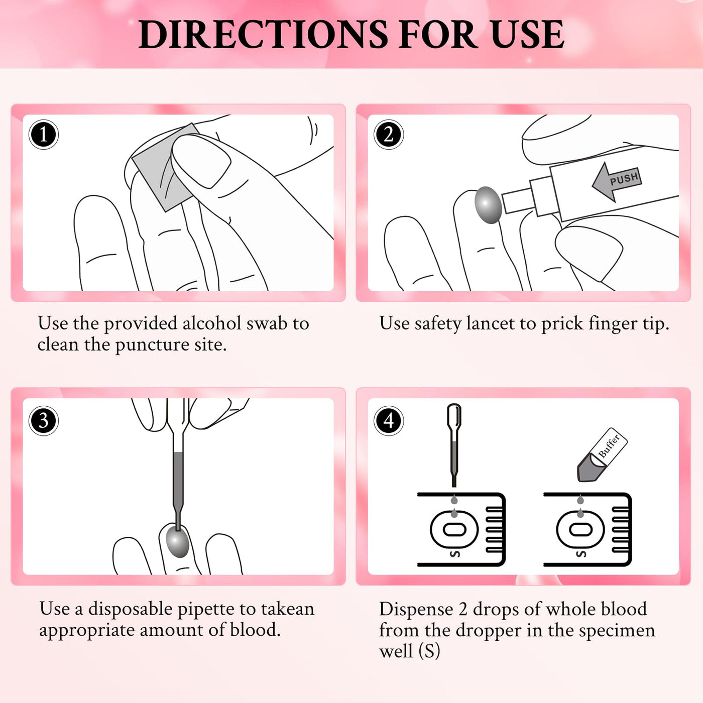 - Ready to use and hygienic: with test cassette, lancet, buffer solution, pipette, alcohol cloth and instructions.