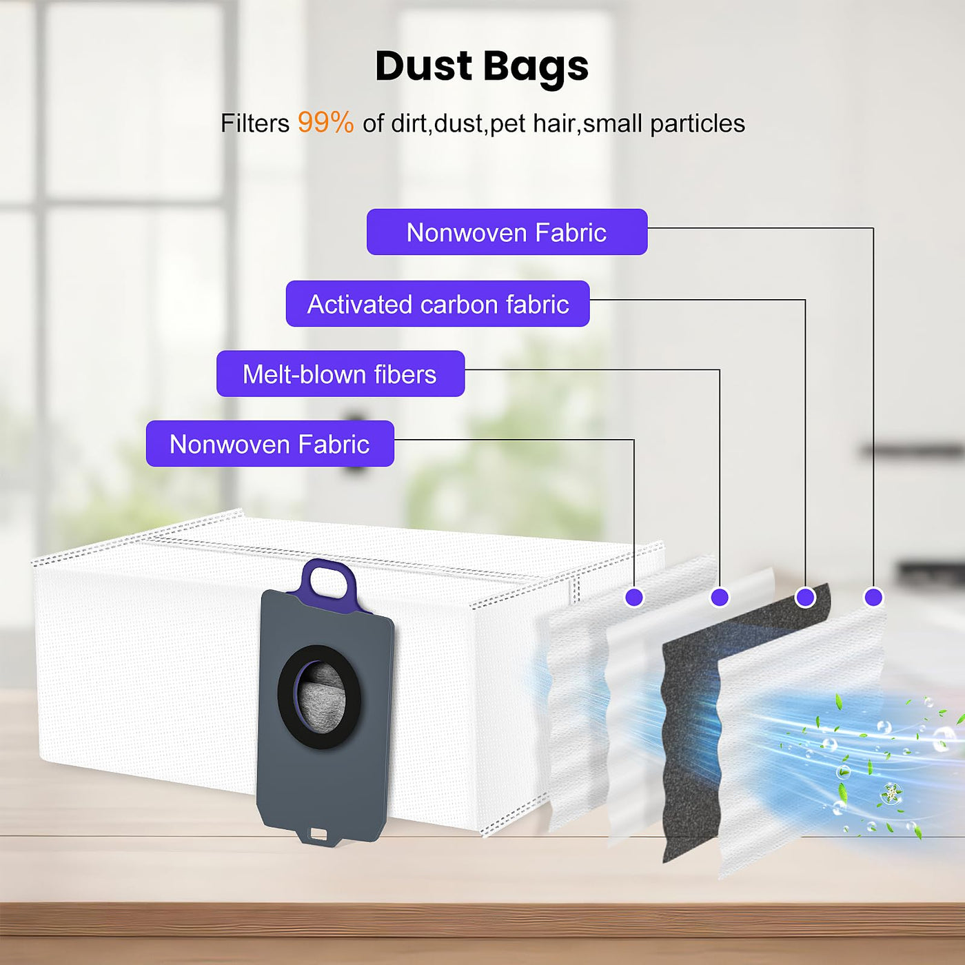 - HEPA FILTERS: Our filters effectively clean 99.97% ofdust, pet hair and other particles. A dual-layer mesh construction resists clogging, ensuring consistent airflow and contributing to a healthier indoor environment by reducing airborne allergens.
