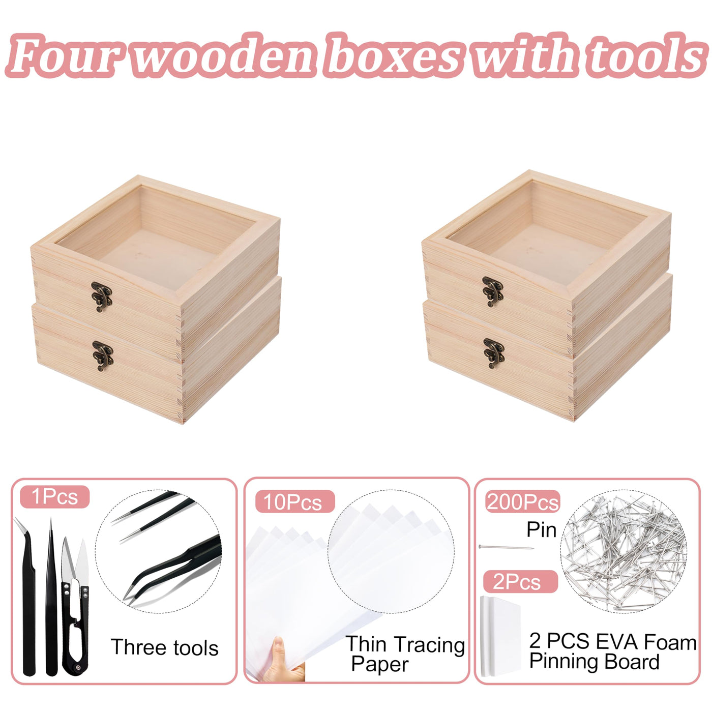 - Complete Insect Specimen Kit: Our Insect Specimen Tools Kit includes everything you need to create bug specimens. It includes 4 wooden display case boxes with clear top, 10 sheets of thin tracing paper, 2 EVA foam pinning boards, a box of 200 pcs pins, 2 tweezers, and 1 U-shaped scissors.