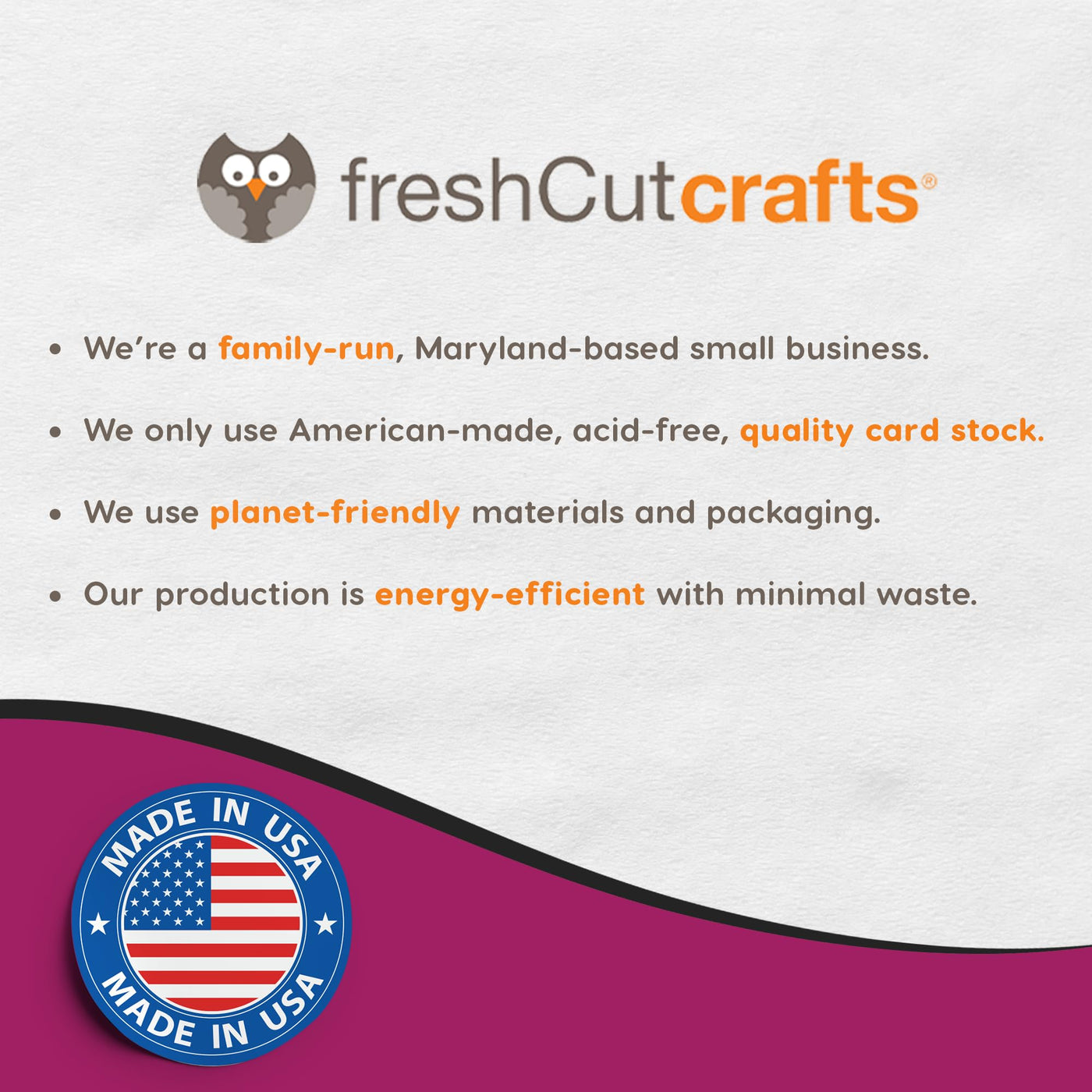 - FEEL-GOOD CRAFTING: At FreshCut Crafts, we're all about crafting with a conscience. Our products are not only about creativity but also about making a positive impact. Proudly family-made in the USA, we use high-quality, acid-free American-made paper that's perfect for preserving memories and creating lasting keepsakes. Our energy-efficient production processes are designed to minimize waste, ensuring that we leave a smaller footprint on the planet.