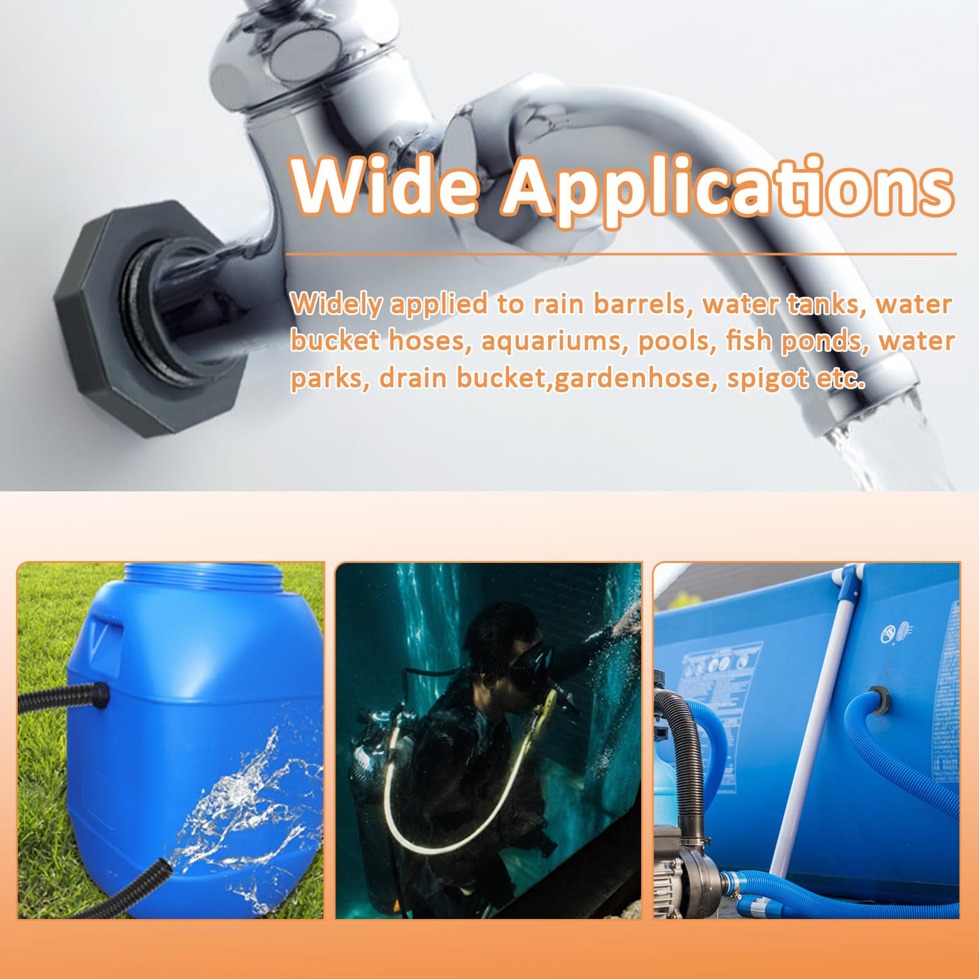 - Universal Fit: Thru bulkhead fittings are widely applied to rain barrels, water tanks, water bucket hoses, aquariums, pools, fish ponds, water parks, drain bucket, garden hose, spigot etc.