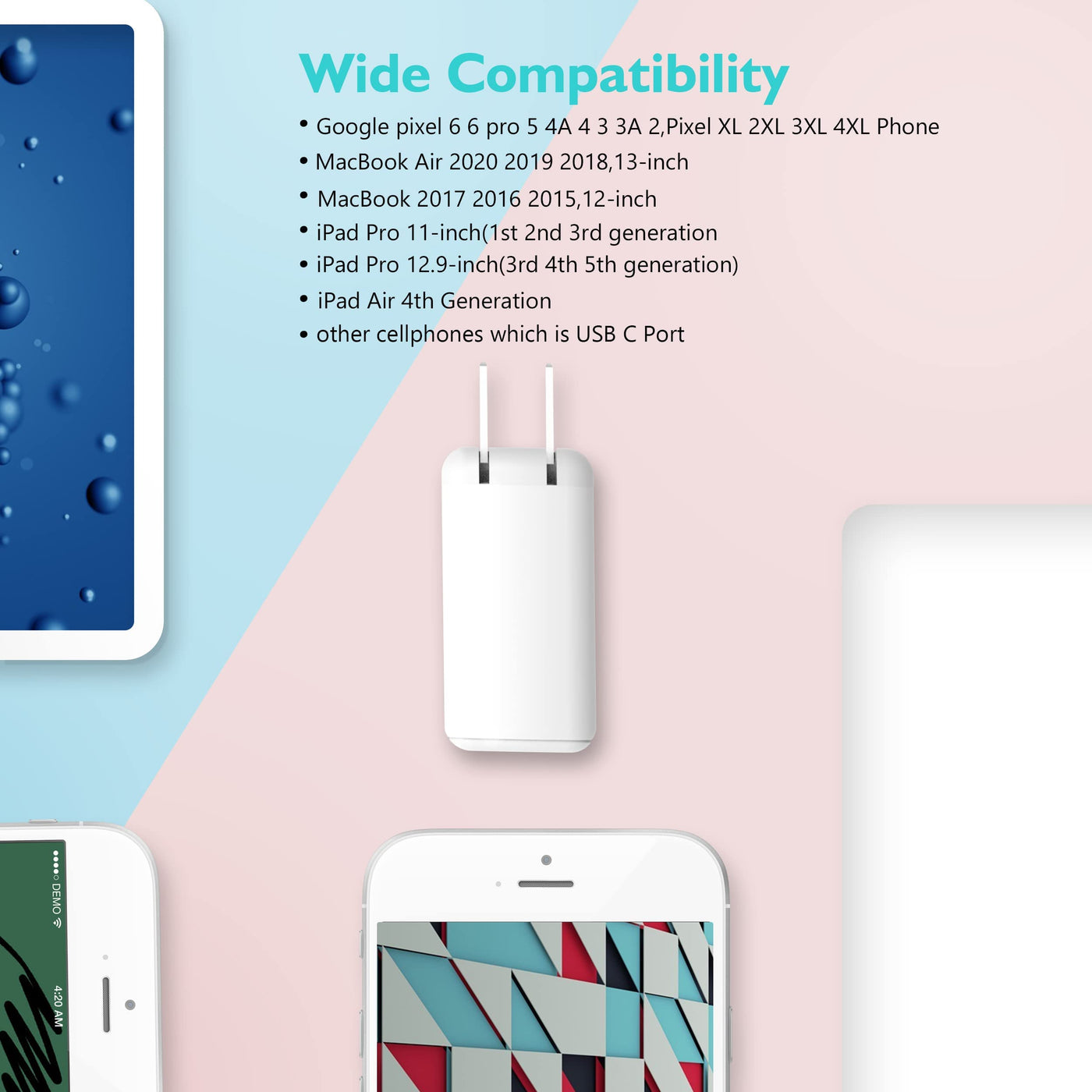 Read more This charger has been tested to ensure it is compatible with: Google Pixel: 6 6 Pro 5 4A 4 3 3A 2,Pixel XL 2XL 3XL 4XL MacBook Air: MacBook Air M1 Chip (2020), MacBook Air (Retina, 13-inch, 2018 2019 2020) MacBook: MacBook (Retina, 12-inch, 2017), MacBook (Retina, 12-inch, Early 2016 2015) iPad Pro: iPad Pro 11-inch(1st generation、2nd generation、3rd generation), iPad Pro 12.9-inch (3rd generation、4th generation、5th generation) iPad Air: iPad Air 4th generation(2020) When you use single charging port to charge USB-C PD3.0: output:5V/3A, 9V/3A, 12V/2.5A, 15/2A, 20V/1.5A (30W Max) USB-A QC3.0: output:5V/3A, 9V/2A, 12V/1.5A (18W Max) When you use 2 ports to charge devices at the same time USB-C+USB-A :5V/4.8A (24W Max)