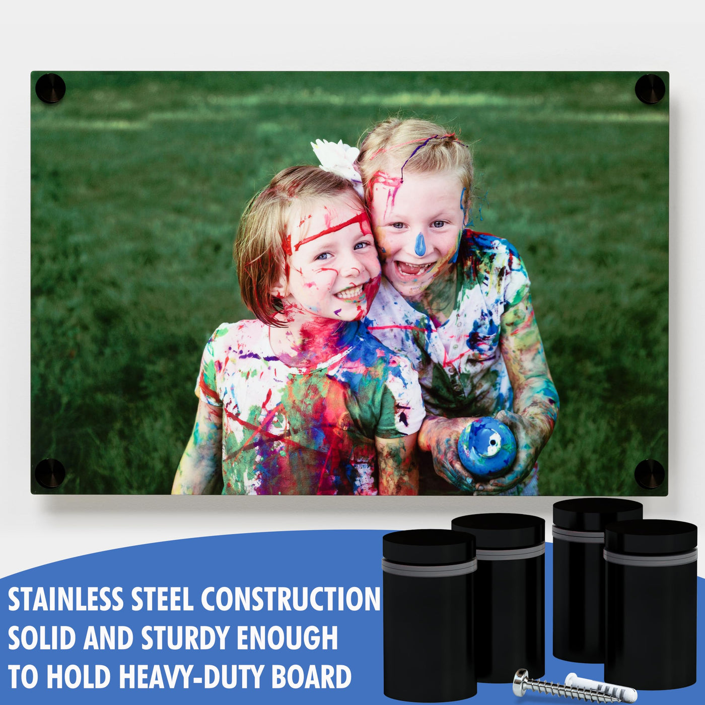 - High-Quality Construction: This set includes 4 wall anchors, 4 screws & 4 top-grade standoff screws, each with 2 rubber cushions. These Black stand offs for acrylic having the dimensions of 12 x1 inch