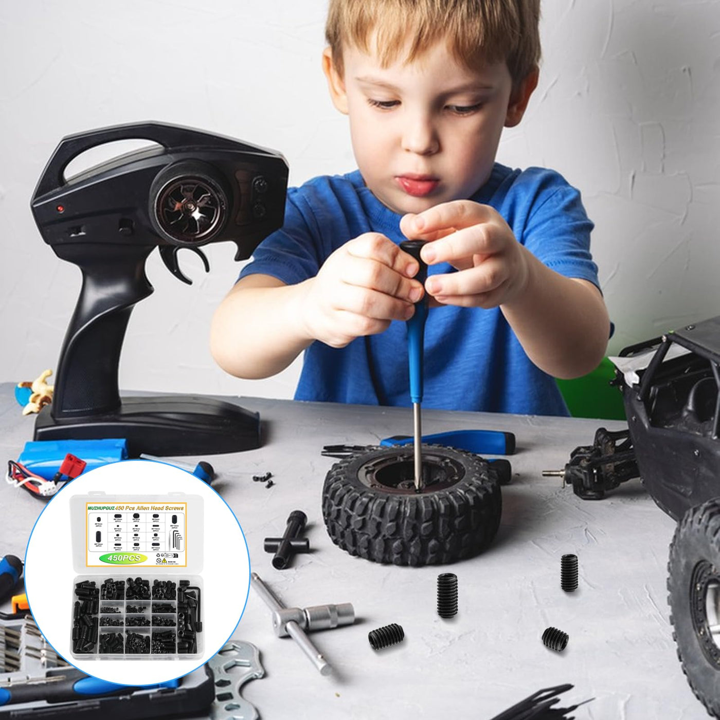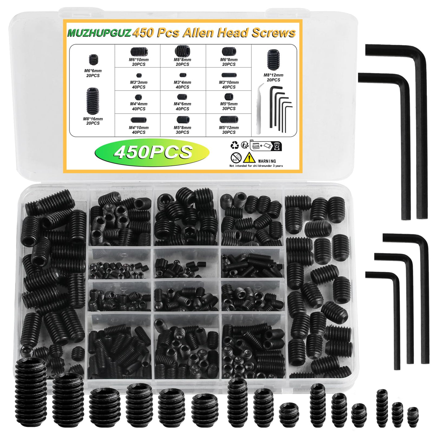 450 Pcs Set Screw Assortment Kit, Allen Head Hex Socket Grub Head Screw Set, Black Hex Drive Cup-Point Grub Screws Set with Internal Hex Drive, with Hex Wrenches, M3/M4/M5/M6/M8
