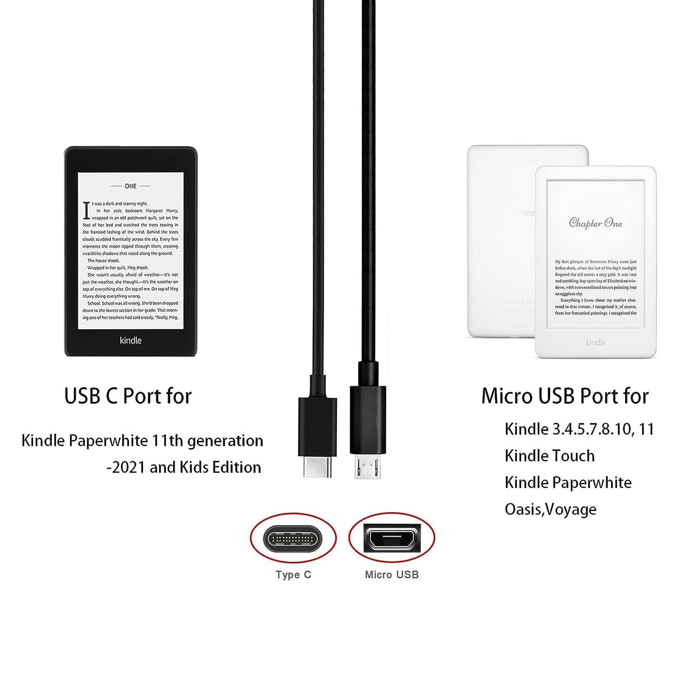 6Ft Fast Charger Fit for Kindle E-Reader 2 3 4 5 6 7 8 9 10 11,All Kindle Paperwhite,Oasis,Voyage,Kindle Touch,DX,Keyboard,Kids Edition(with 6Ft Micro USB & USB C)