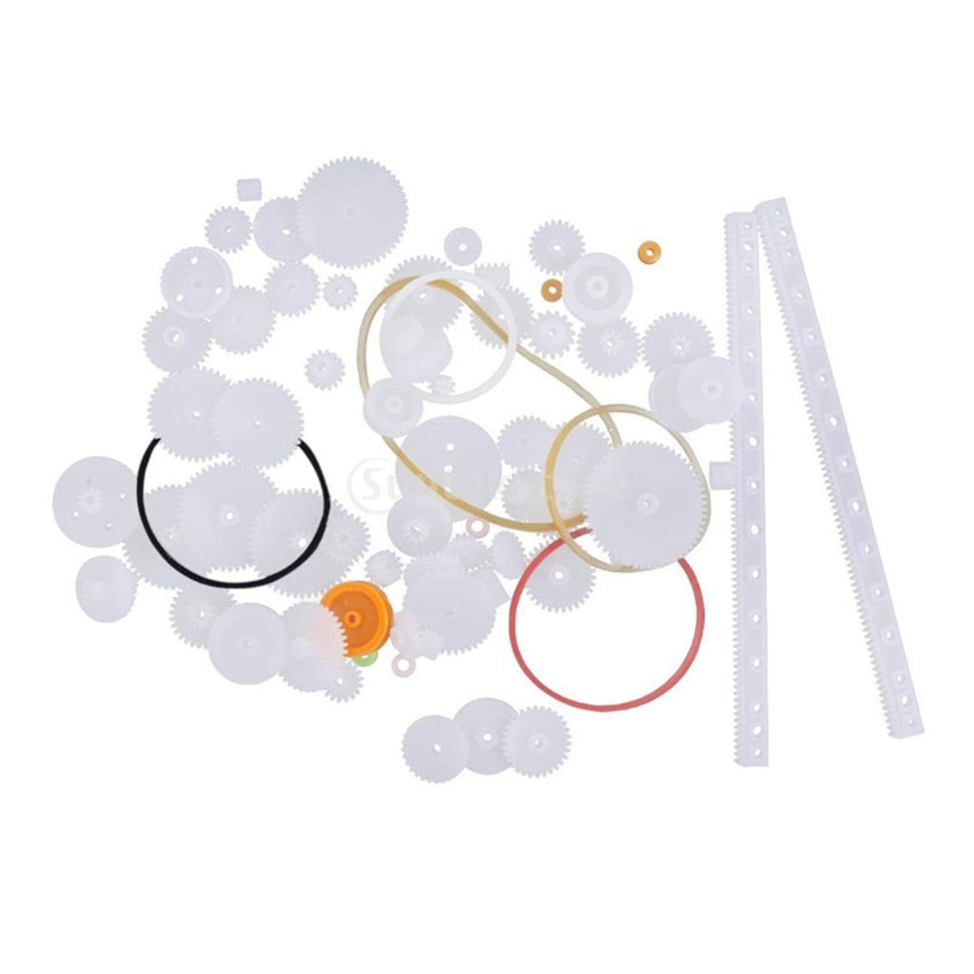 - 75 Type Plastic Crown Gear Single Double Reduction Gear Worm Gear Description: Material: plastic Type: spindle gear, crown gear, single gear, double gear, worn gear, bevel gear, belt pulley, belt, connecting rack, axle sleeve, tee collar Quantity: 75 Feature: 75 type ideal for DIY science and small production, product design and mechanical model Package included: 19X Double Reduction Gear(each one) 12X Single Reduction Gear(each on) 11X Crow Gear(each one) 2x Worm Gear(each one) 9X Spindle Gear(each one) 7X Belt Pulley(each one) 6X Axle Sleeve(each one) 5X Belt(each one) 2X Connection Rack(each one) 1X Tee Collar