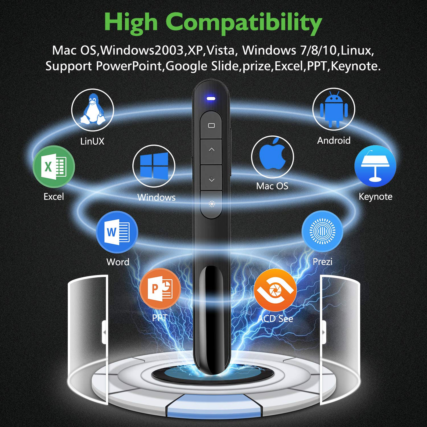 - Support options: Supports PowerPoint, MS Word, Excel, ACD See, website, iwork (Keynote& Numbers&Pages), Gooles Slides, Prezi,etc; Supported OS: Win2000,XP,Vista,Win7,Win8,Win10,MAC OS, Linux