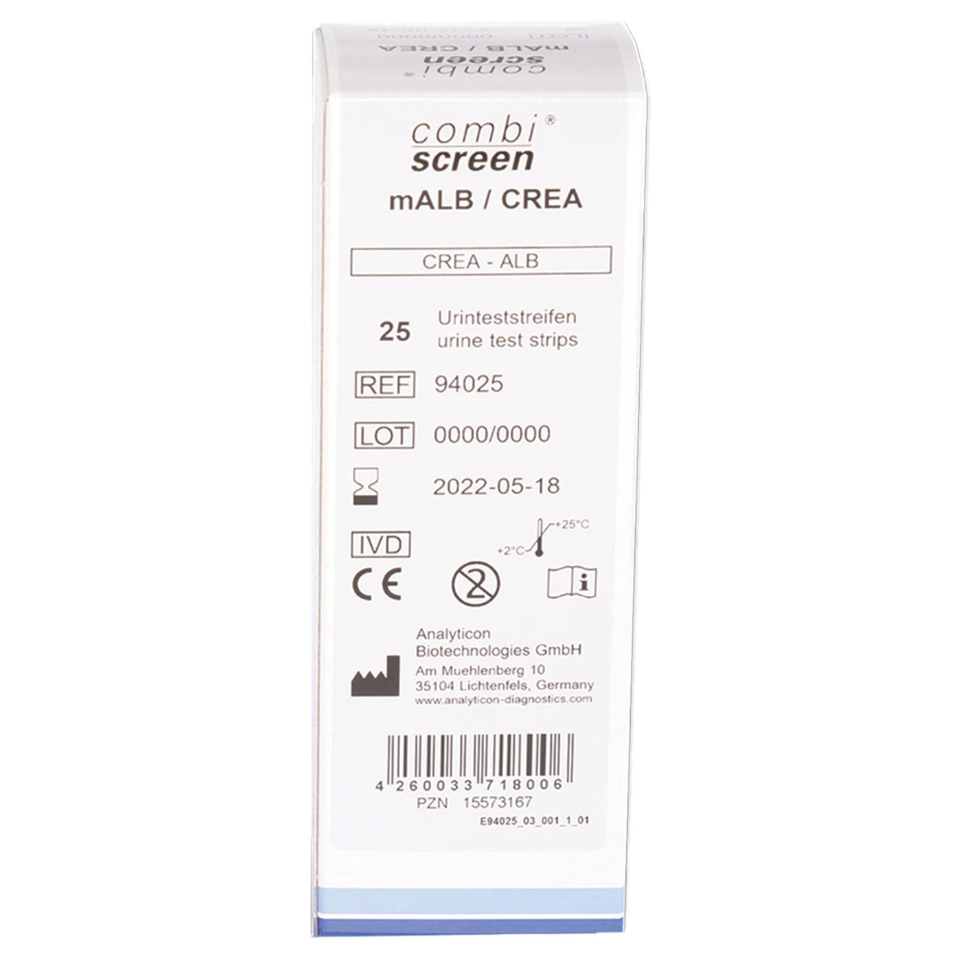 Combiscreen mALB/CREA 25 tube Visual test for detecting microalbuminuria based on albumin-creatinine ratio, which provides accurate information on the albumin content in urine, regardless of the concentration of the latter.