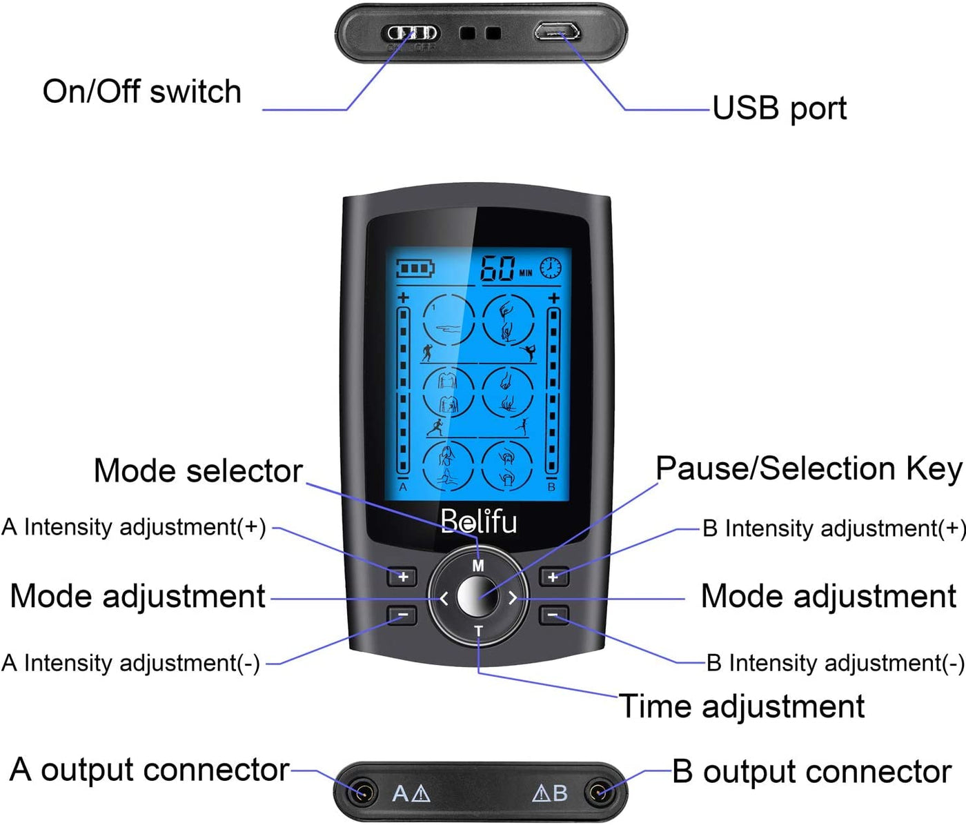Read more Read more Belifu TENS Unit Electric TENS Machine Fit for Your Pain Management and Body Relax. Non-Invasive, Non-Drug Choice for Relieving Pain. Great Device You Can Use at Home for Pain Management. By placing the pads exactly at the site of the pain, you get fast relief, without having to digest potentially harmful or addictive prescription medicine. If you have any type of pain such as pain associated with sore and aching muscles in the shoulder, waist, back, neck, upper extremities (arm), and lower extremities(leg) due to strain from exercise or household work activities, it can provide you with immediate relief. It is just like a natural process as it is done by your own body, it helps with reducing the pain by stimulating the nerve ends. At Belifu, we are passionate about creating products that enrich your health and celebrate your life. Our goal is to deliver products that help others live better. Belifu strives to consistently improve our products and customer service. We value quality in order to best serve our customers and enrich their lives. Using Tips: 1. If you only plug one wire, you should make sure that two pads connected with the same wire are placed on your skin at the same time so that the unit can work properly. If you plug two wires, you need to connect the 4 or 6 pads to the both wires and then place all of these pads on your skin at the same time, otherwise it will not work. 2. The TENS device will be shut off automatically because the timer is set for 10-60 minutes. The max timing for one running is 60 minutes. If you need more therapy for longer than 60 minutes, you need to reset it. Note: Not suitable for pregnant women and hypertension patients, and not safe for people with pacemakers. Belifu TENS Unit Electrode Pads 20 PCS 4 Independent Channel TENS EMS Unit TENS EMS Unit Muscle Stimulator with 12 Pads Belifu Large Electric Heating Pad for Back Pain Belifu Touch ScreenTens Unit Electro Muscle Stimulator Belifu Touch ScreenTens Unit Electro Muscle Stimulator Belifu TENS Unit Electrode Pads 20 PCS 4 Independent Channel TENS EMS Unit TENS EMS Unit Muscle Stimulator with 12 Pads Belifu Large Electric Heating Pad for Back Pain Belifu Touch Screen Tens Unit Muscle Stimulator Belifu Touch Screen Tens Unit Muscle Stimulator
