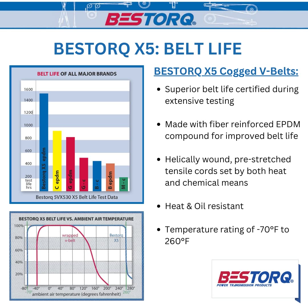 - BESTORQ X5 cogged V-belts bring in a new generation of V-belt performance; These belts are constructed of highly engineered, high-performance components that are manufactured using the latest in belt technology available on a global basis