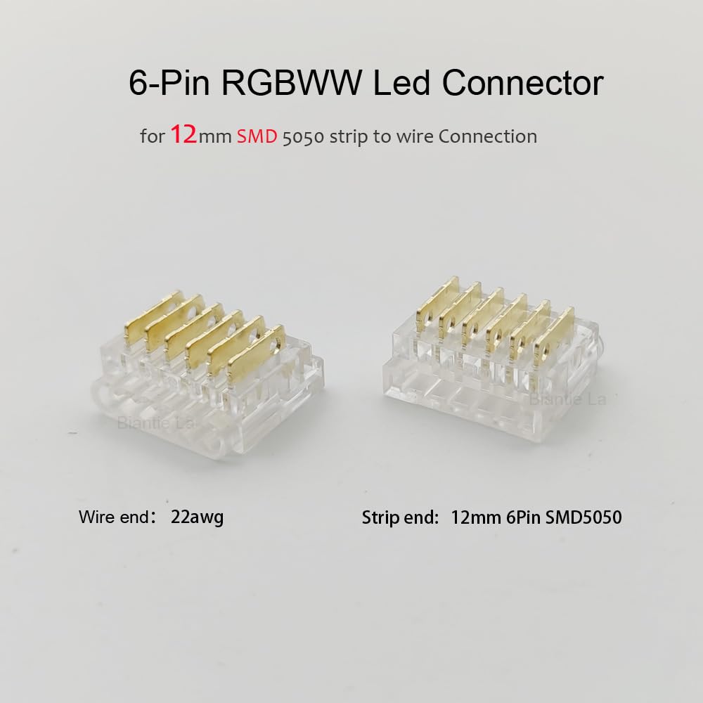 Biantie La - Simply connect and illuminate! 12mm 6-pin RGB+CCT LED Strip Connector Kit This 12mm RGB+CCT LED strip connector kit provides everything needed for a professional DIY installation. Featuring a range of 20 durable yet compact connectors to join strips end-to-end or attach to power supply and controllers, you can easily configure custom lighting for residential, retail or commercial spaces. Featuring an innovative clamp-on design, these 6-pin connectors simply snap onto the copper pads of your LED strip to create a permanent joint. Slowly clamping down the connectors with a pair of pliers (not included) presses the contacts together, allowing power to flow freely through the connection. Once secured, the connectors cannot be detached. Only works with 12mm wide SMD 5050 LED strip lights with 6 soldering pads. Not compatible with 10mm 8mm or 5mm LED strips. What's Included: 20pcs Strip-to- Wire Connectors - For connecting 12mm RGBWW LED strips to 22 AWG power wires or controllers. How to Use the LED Strip Splicing Connectors 1. Select the appropriate length of 22 AWG wire without stripping the insulation. 2. Insert the wires into the wire slot on the connectors. Use pliers to gently clamp down and secure the wires in place. 3. Insert your LED strip into the strip holder end of the connectors, aligning the solder pads on your strip with the 6 pin needles in the connectors. 4. Use pliers to firmly press on the pin needles of the connectors slowly to ensure they fully pierce the wires and LED strip. 5. The connection is now complete. Contact customer support with any product questions. We provide comprehensive answers and tech support.