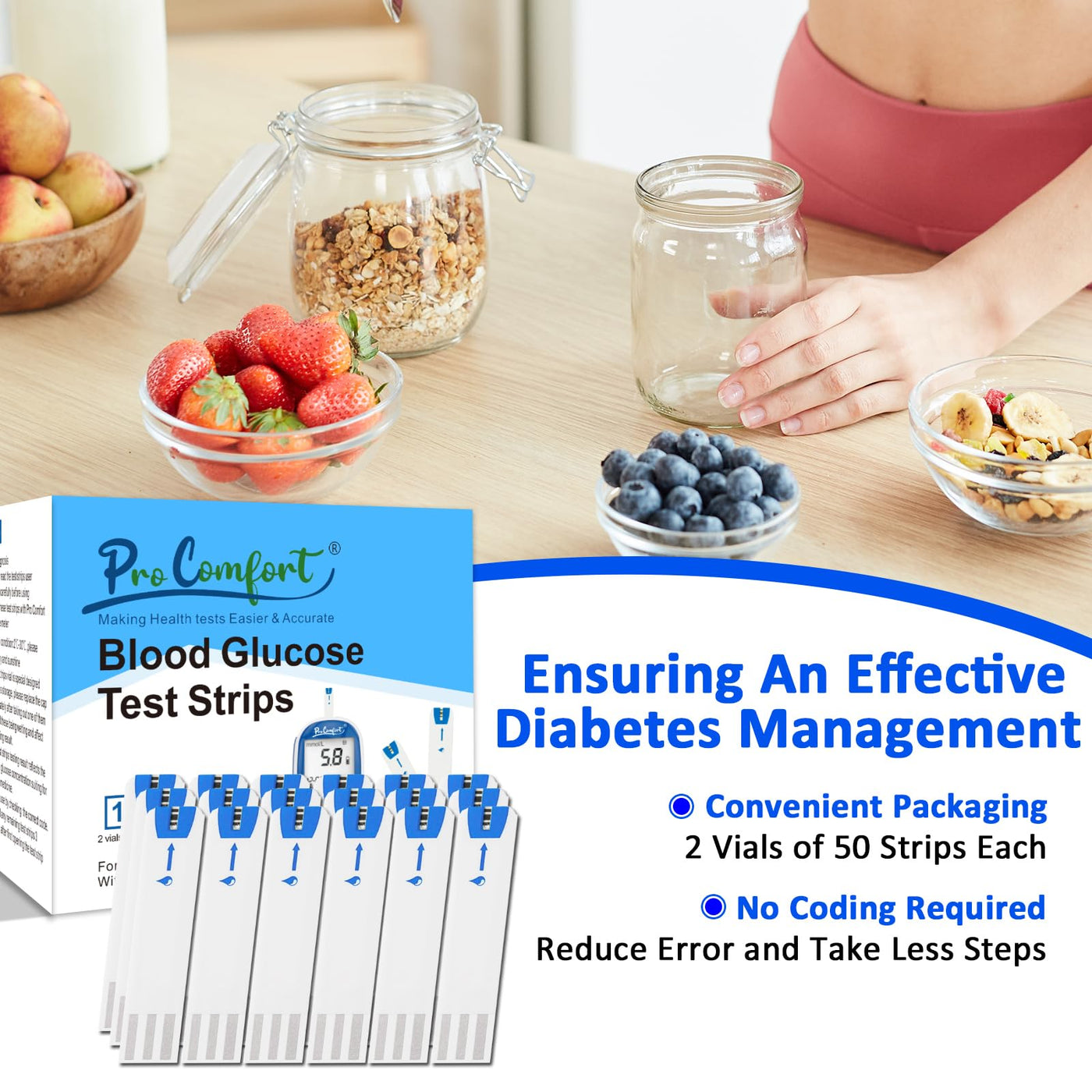 Blood Glucose Test Strips for Diabetes 100 Count Blood Sugar Test Strip, Used with Pro Comfort Glucose Monitor Only, No Coding