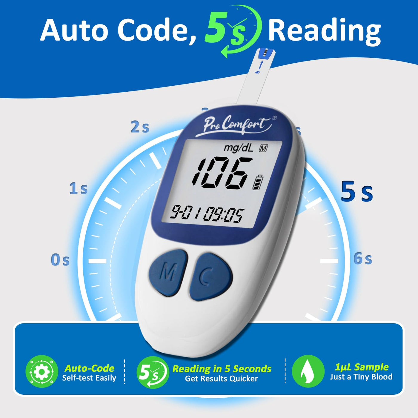 - Quick and PainlessOnly wait for 5 seconds to get reasults and just tiny 1 microliter blood sample required, simplify the process and be less painful to be self-testing
