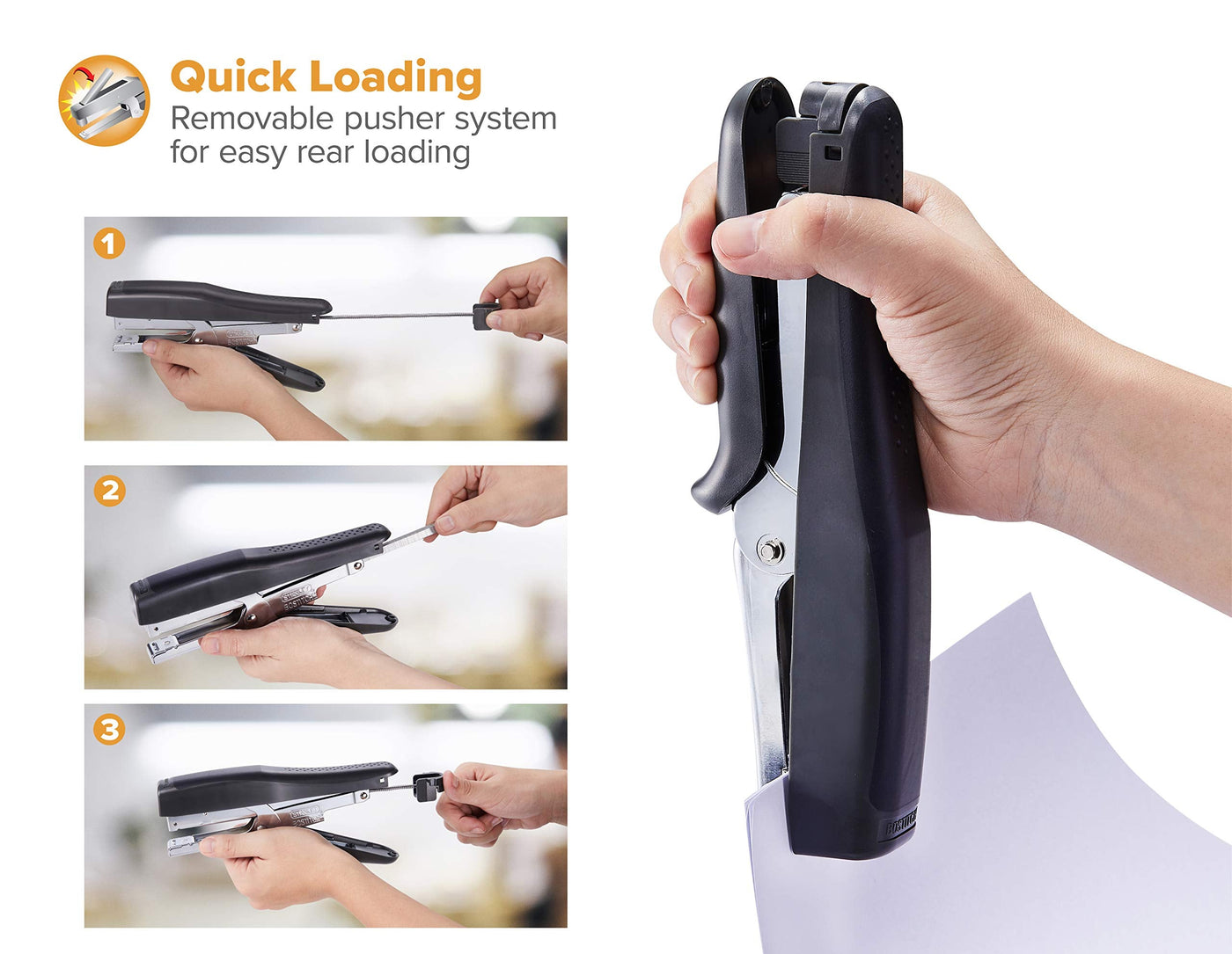 - Black in color with metal and composite construction for quality and durability. With Soft rubber handle for stapling comfort