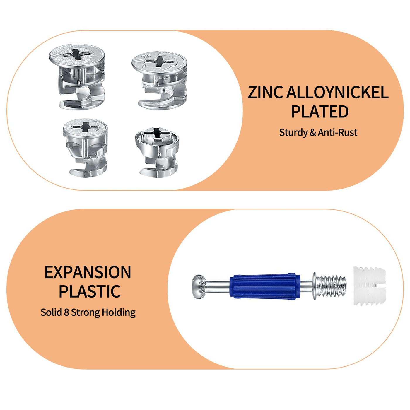 - 3-in-1 Cam Locks for Furniture: The set includes fasteners cam nuts, cam lock screws, and plastic expansion nuts, suitable for furniture repair, parts replacement, woodworking, the cooperation of 3 different parts makes it stable after assembly.