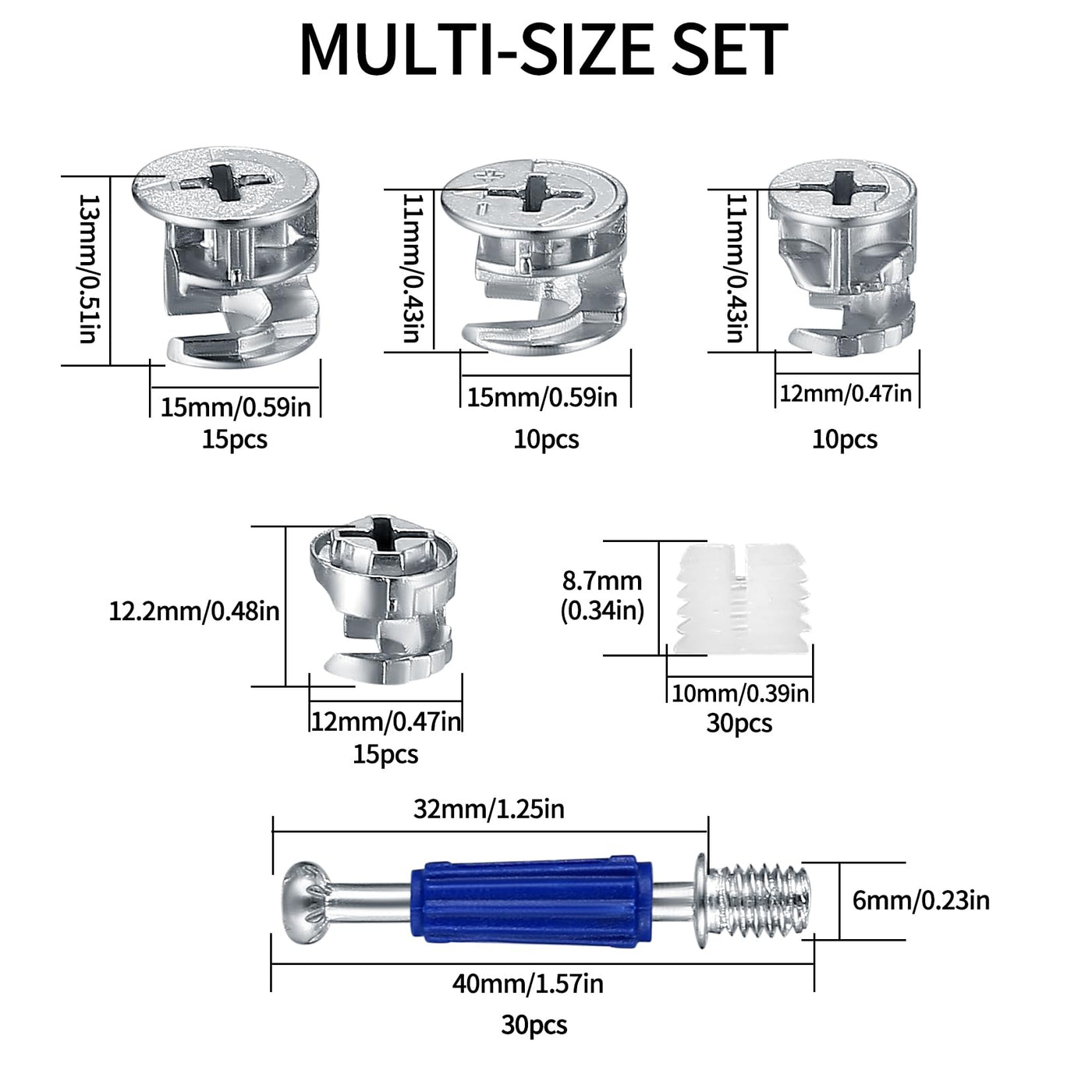 - Package Includes: 110 pcs in total, size includes: 10 pcs 12*10.5mm cam nuts, 15 pcs 12*12.2mm cam nuts, 10 pcs 15*11.5mm cam nuts, 15 pcs 15*13mm cam nuts, 30 pcs cam lock screws, 30 pcs plastic expansion nuts, sufficient quantity and rich size to meet the needs of daily use.