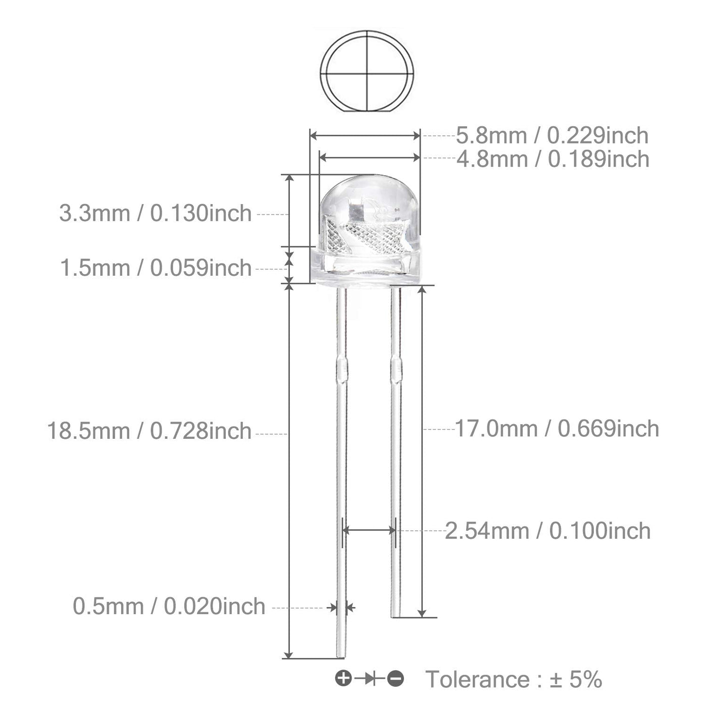 Specification:Quantity: 100 pieces / PackLens: 5mm Diameter / Transparent / Straw HatEmitting Color: Red Green Blue Slow Flash AutomaticallyLuminous Intensity: 2500-3500mcdViewing Angle: 120 DegreeForward Voltage / Current: 3V-3.2V | 20mAPolarity: Anode (Longer Part) | Cathode (Shorter Part) Search "chanzon led diode" for more related leds.