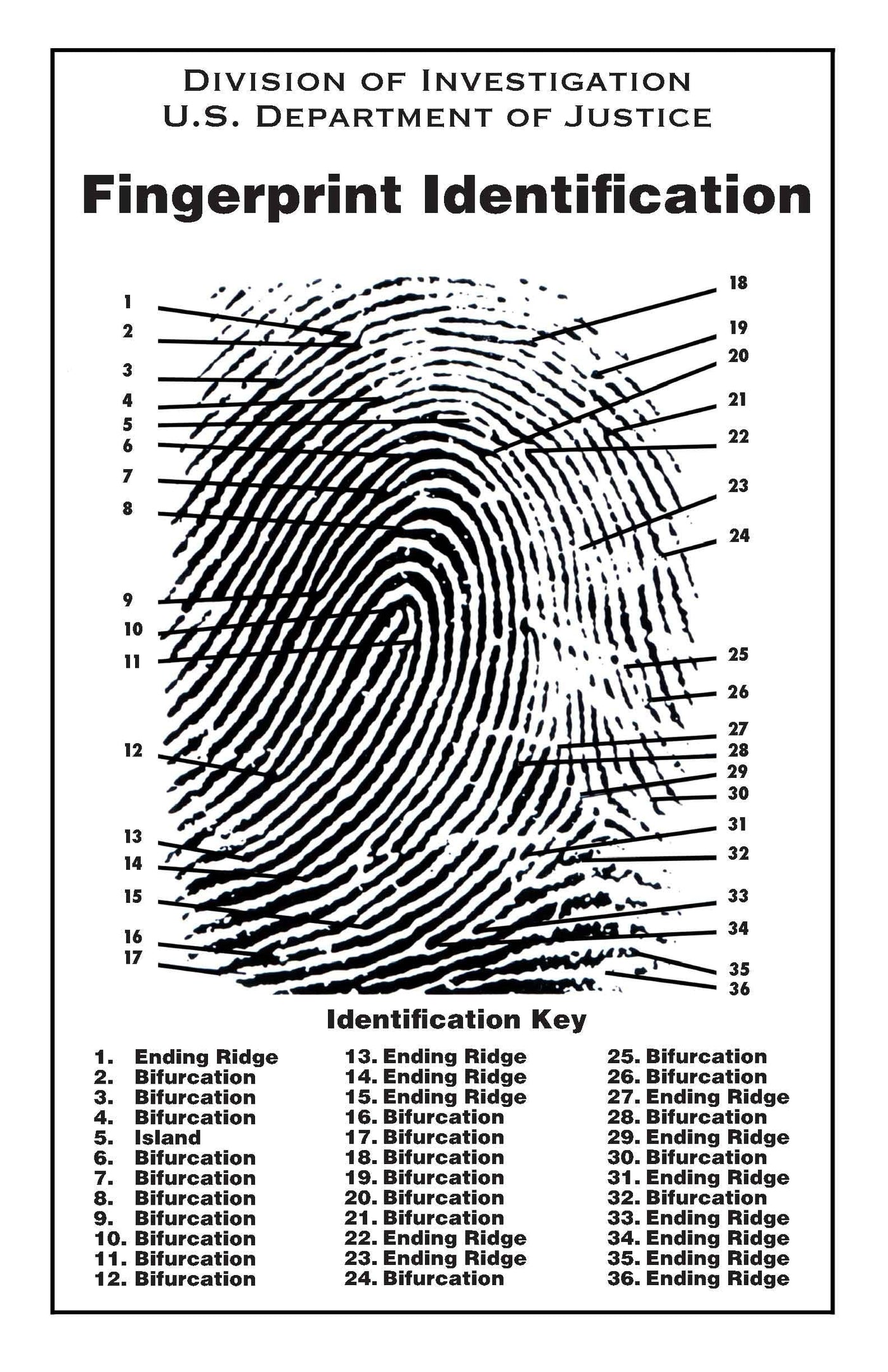 - This poster shows ridge characteristics or minutiae, used to match fingerprints. The most common ridge characteristics are bifurcations, ridge endings, and islands.