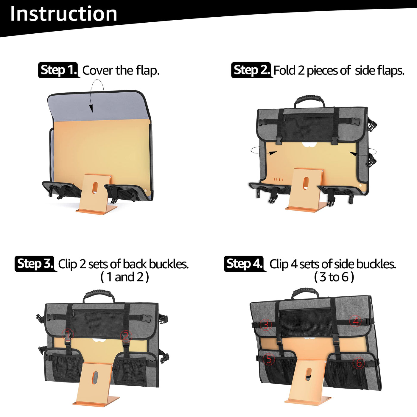Read more CURMIO 24 INCH MONITOR CARRYING CASE (Bag only, NOT includes other accessories.) Dimensions 21.3 x 15 inches.Front pocket with hook and loop closure for keyboard (L18.5” x W6”), trackpad, mouse pad. Read more Back mesh pockets with elastic top for mouse, wires, hard drive, headphone, etc.Adjustable back buckles provide an effective solution to fit computer monitor snugly.Great fit compatible with Apple 24 inches iMac and most 24" monitor screens. Read more Made of heavy duty nylon material, padded with foam, lightweight and durable. Soft velvet lining offers your computer monitor a full protection away from scratches. Comfortable rubber handle helps a lot while carrying computer screen on the go. Read more INTRODUCTIONS Step 1 Cover the flap. Step 2 Fold 2 pieces of side flaps. Step 3 Clip 2 sets of back buckles (1 & 2). Step 4 Clip 4 set of side buckles (3 to 6). Read more Monitor Screen Dust Cover Monitor Screen Carrying Bag Monitor Screen Carrying Bag Monitor Screen Dust Cover Monitor Screen Carrying Case Monitor Screen Carrying Case with Wheels Compatible with Universal 24" Computer Monitor Apple 21.5" iMac Apple 27" iMac Apple 27" iMac Apple 21.5" iMac Apple 27" iMac Features Rubber Handle PU Leather Shoulder Strap PU Leather Shoulder Strap Rubber Handle Detachable Shoulder Strap Detachable Trolley Color Black, Gray Black Black Black, Gray Black Black