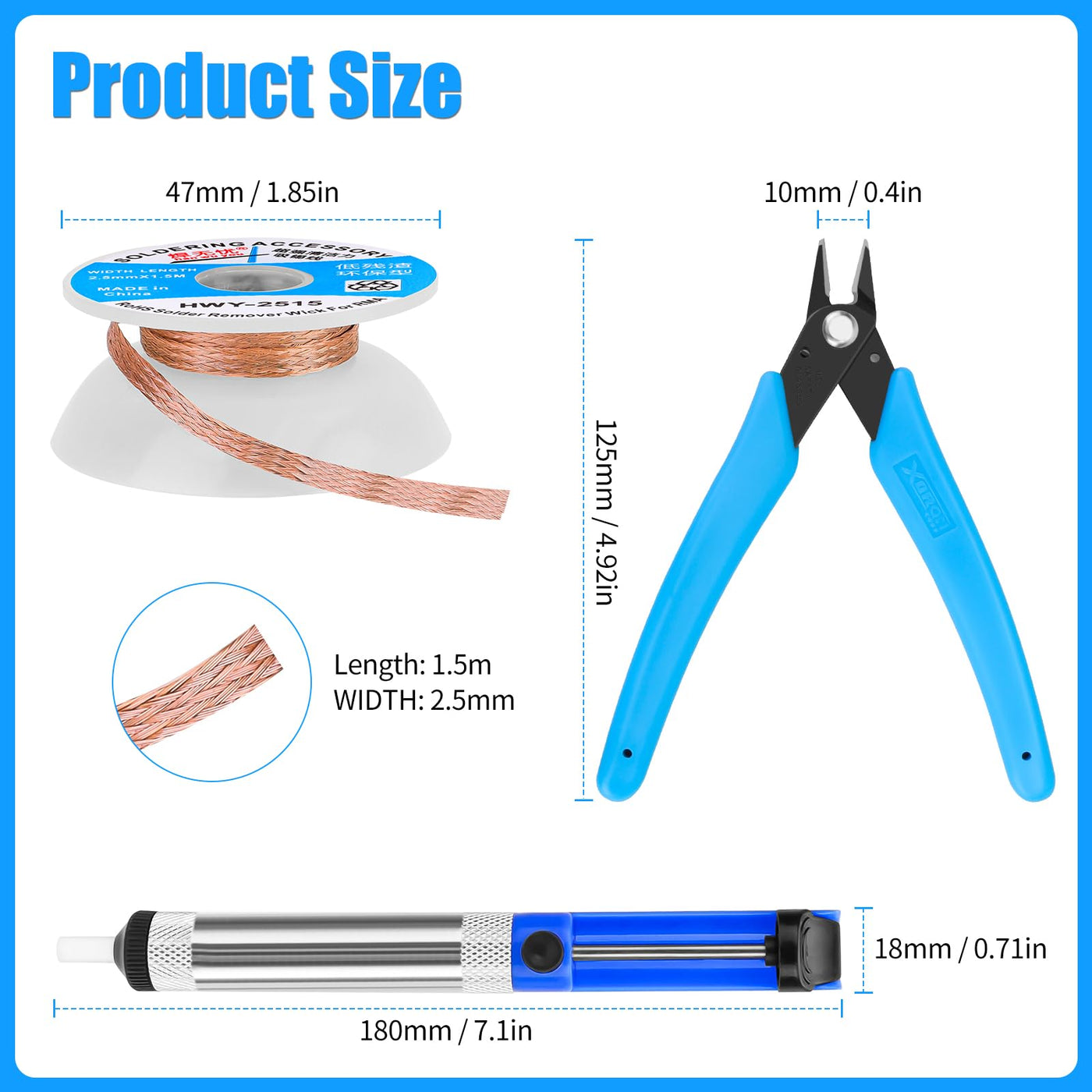 - What you have: the solder removal tool kit comes with 1 * desoldering pump, 1 * micro shear wire cutter pliers and 1 * no-clean solder wick, which will meet your different requirements