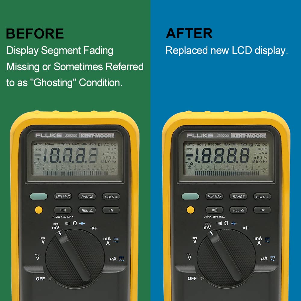 Product: Display Replacement for FLUKE 87 87- lll Kent-Moore J-39200 Digital Multimeter (Will NOT Compatible with Fluke 87V 86 88 83 85 nor Other Versions) Please compare our full display pattern with yours before purchasing. For Repair Digital Display Segment Fading Missing or Sometimes Referred to as "Ghosting" Condition and Screen Cracked or has Black Blotches. NOTE: The backlighting feature on 87 series Multimeters is a seperate plug in incandescent green lamp module and a discrete circuit, and this display has nothing to do with it's color and /or operation. It suit for DIY, no soldering required, do repair it would complete around 10 minutes. It will save you $50.00 to $100.00 to have someone else do it for you! Screen Size: 7042mm Package Including: 1PCS LCD Display with 2PCS Elastomeric Zebra Connector Rubber Strips We selling LCD display with rubber strips only, the digital multimeter in picture as an application scenario instruction, not included for sale.