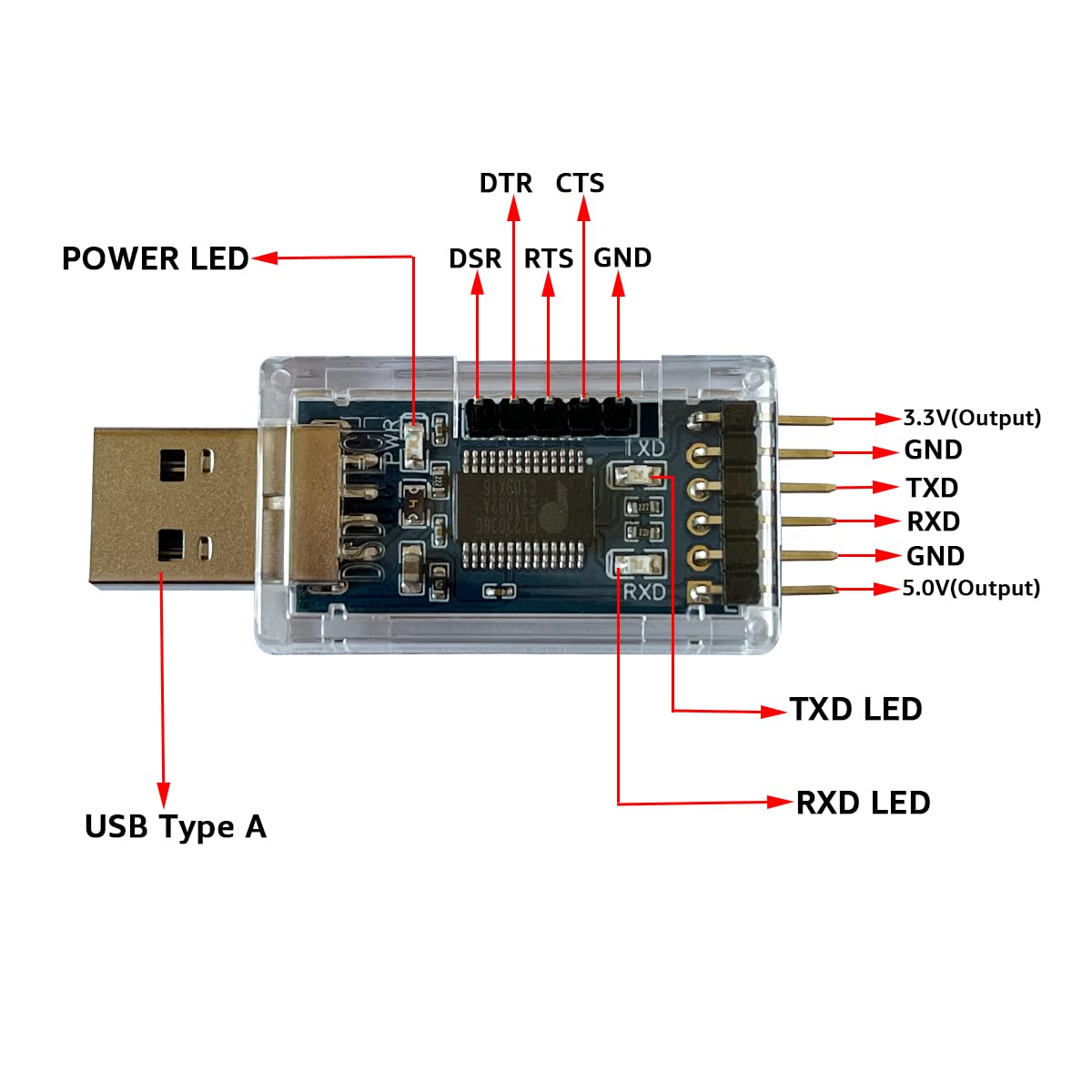 - USB to TTL: Interface with TTL Serial Device using this USB Type A Serial adapter. The pin interfaces are: VCC (5V), VCC(3.3V) ,GND, TX, RX, CTS, RTS. Very suitable for electronic engineering development or burning various firmware.