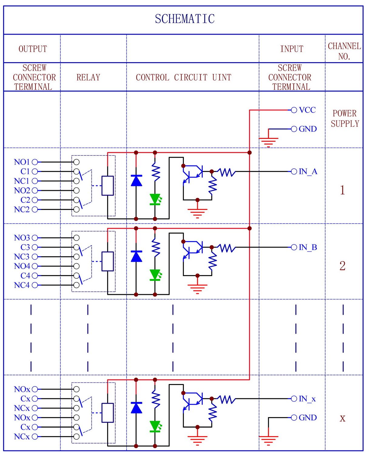 - Darlington transistor circuits drive relay coil, LED indicator for each relay channel.