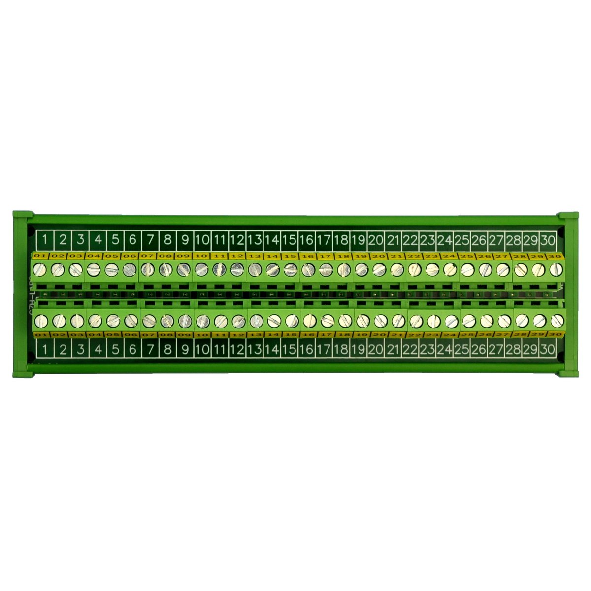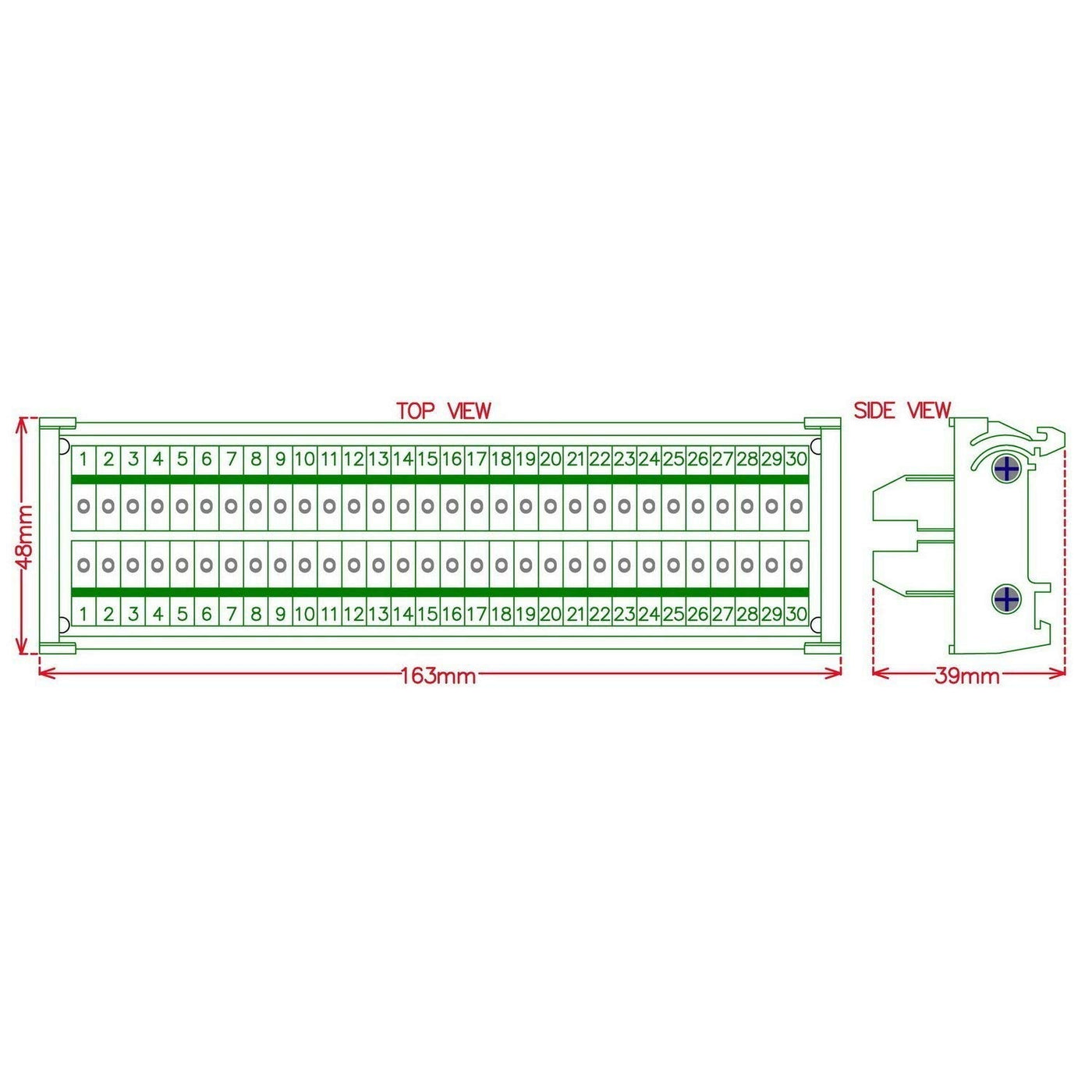 DIN Rail Mount 24A/400V 30 Position Screw Terminal Block Distribution Module.DIN rail mount carrier: High quality Taiwan DINKLE fireproof nylon material DIN rail mount carrier (not China low quality carrier), can support width 35mm rail.Terminal Block: Pitch 5.0mm/0.197" Wire range 26AWG ~ 12AWG / 2.5mm2 Rated voltage 400V, rated current 24Amp. Strip length 7mm. Screws - M3,steel,Cr3+ Zn plated. Pin header and Cage - Brass.Change Notification: from June-4, 2018, we change the product pictures and added position number labels of terminal block.