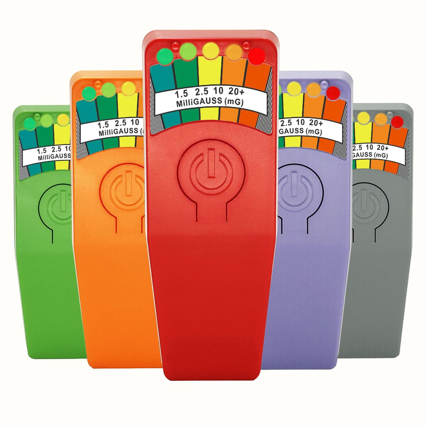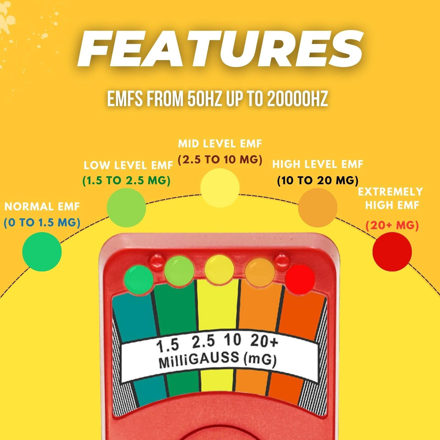 - Easy to Read Ghost Detector] The 1st Light detects a Normal EMF field, detects range is between 0 to 1.5 mG. The 2nd Light (GREEN) detects a Low Level EMF, detects range is between 1.5 to 2.5 mG. The 3rd Light (YELLOW) detects a Mid Level EMF, detects range is between 2.5 to 10 mG. The 4th Light (ORANGE) detects a High Level EMF, detects range is between 10 to 20 mG. The 5th Light (RED) detects an Extremely High EMF Range of 20+ mG.