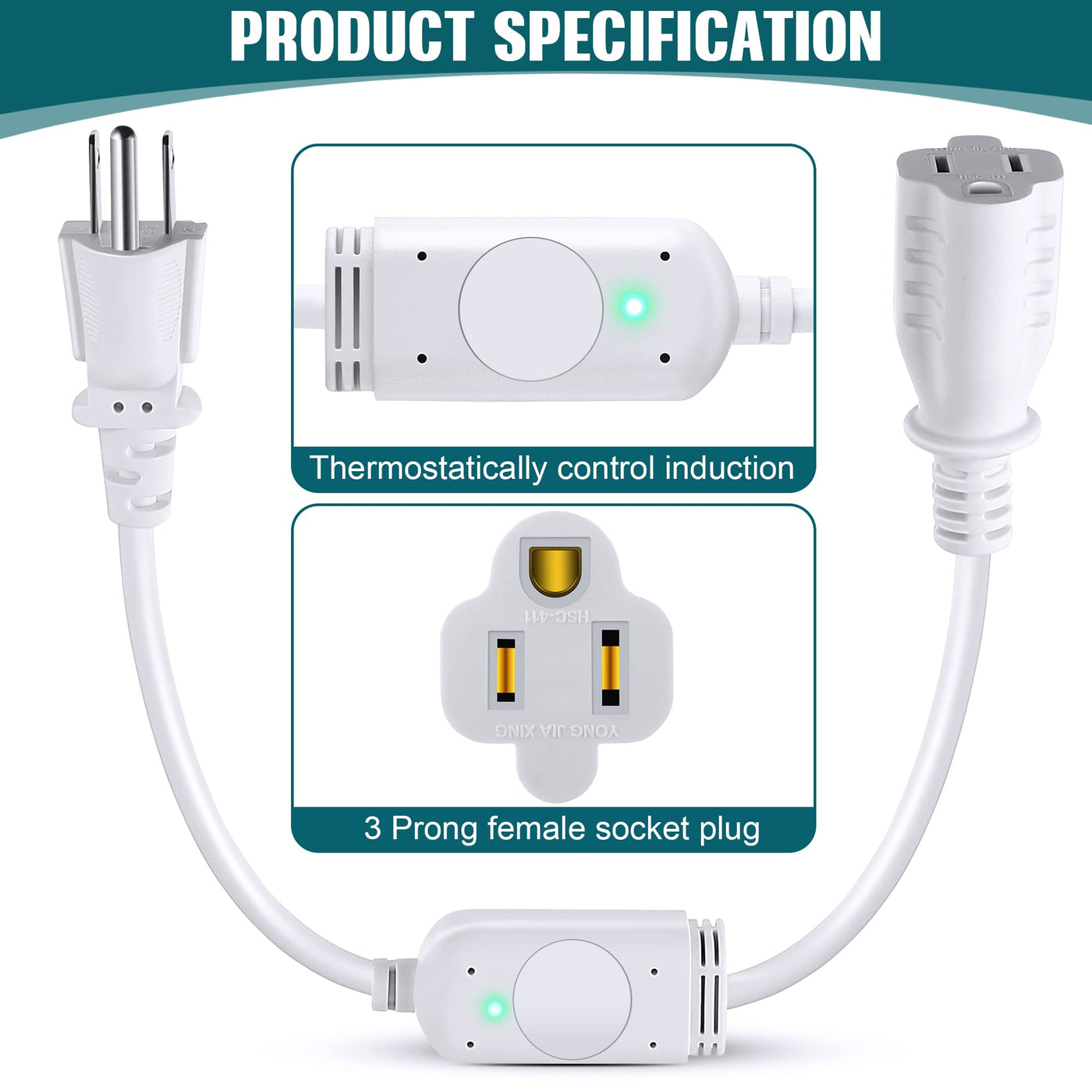 Thermostatically Controlled Extended Power Cord Can be applied in many situations, such as home farm deicer, pond deicer, RV, garage, greenhouse, bird tub, farm, unheated room, etc. Specification: Size: 17 inch/ 43 cm in length Color: white With female plug, easy to connect Temperature controlled range: 0--10 degrees/32 ℉--50 ℉ Automatic sensor on the cord, help the device ON/OFF when the temperature changed. Made of reliable material, can provide a long time use. Package content: 2 x Power cords Warm tips: Please observe the electrical principle to avoid short circuit or other incidence. Thermostatically control, when the temperature is sensed to exceed 50 degrees Fahrenheit, the power will be automatically disconnected to ensure safety. Do not use in water. Please unplug the cord when finish using. Please contact us if you have any question.