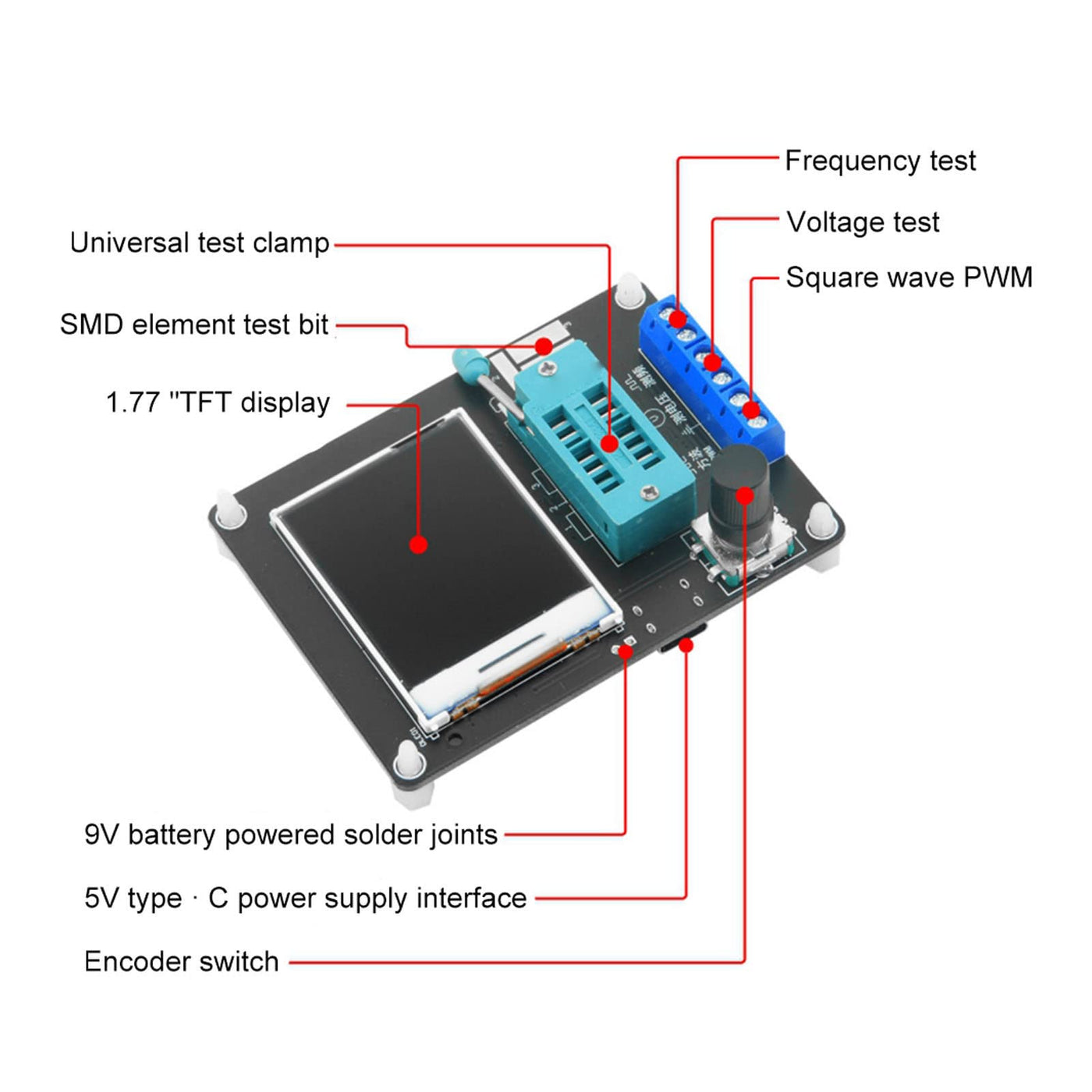 - Power Interface: The transistor tester uses 5V Type C power interface for power supply, or it can be soldered to 9V battery interface for automatic shutdown, and the shutdown current is only about 20nA.