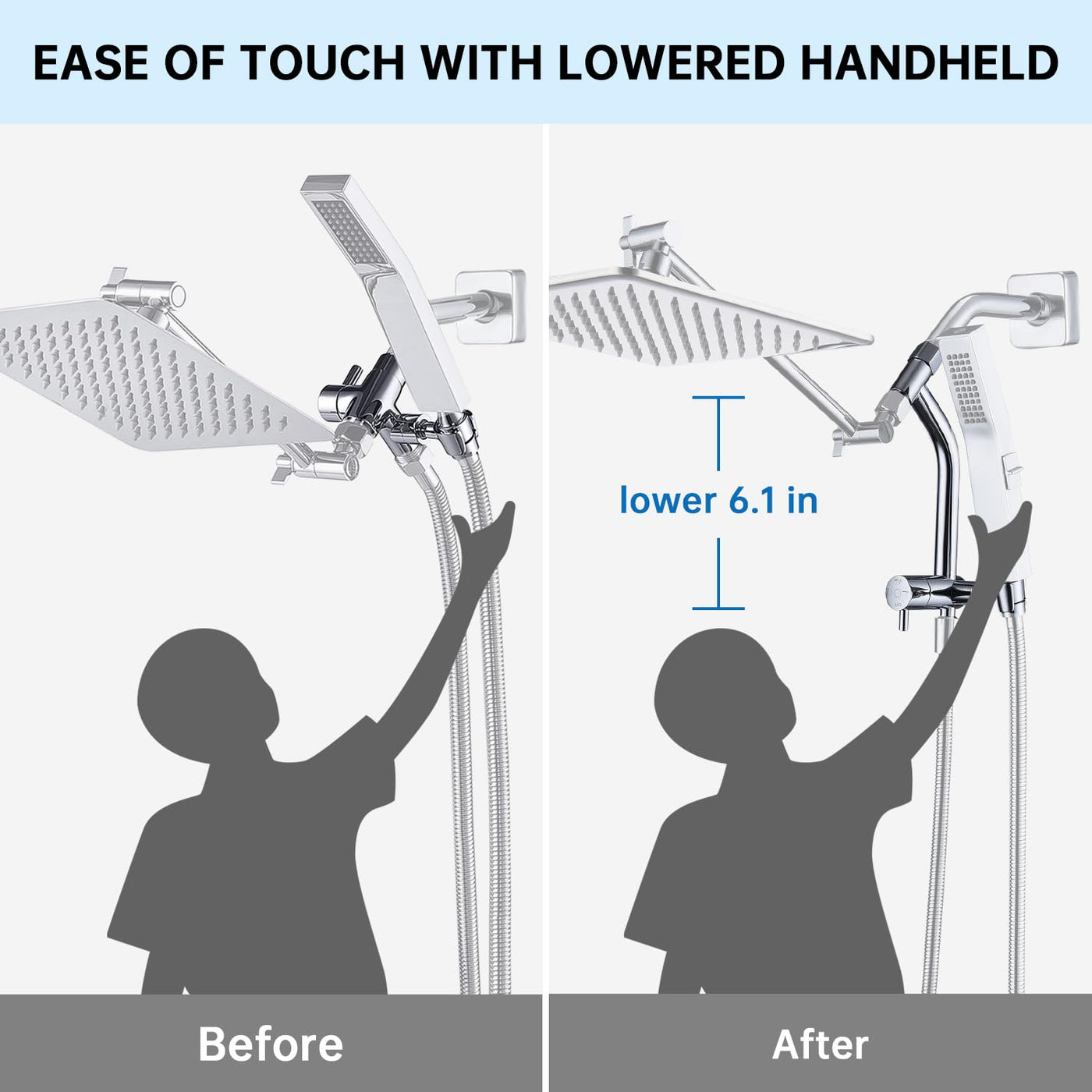 - INNOVATIVELY DESIGNED OF lOW-LEVEL HANDHELD HOLDER: Compared to traditional style shower diverter with holder, this newly upgraded diverter not only makes it easier for you to adjust the mode with one reach,but the low position of the handheld mount also makes it easier for you to reach the handheld shower head and an overall more enjoyable shower.Family members of different heights and people with reduced mobility can also enjoy the shower more conveniently during adjustment.