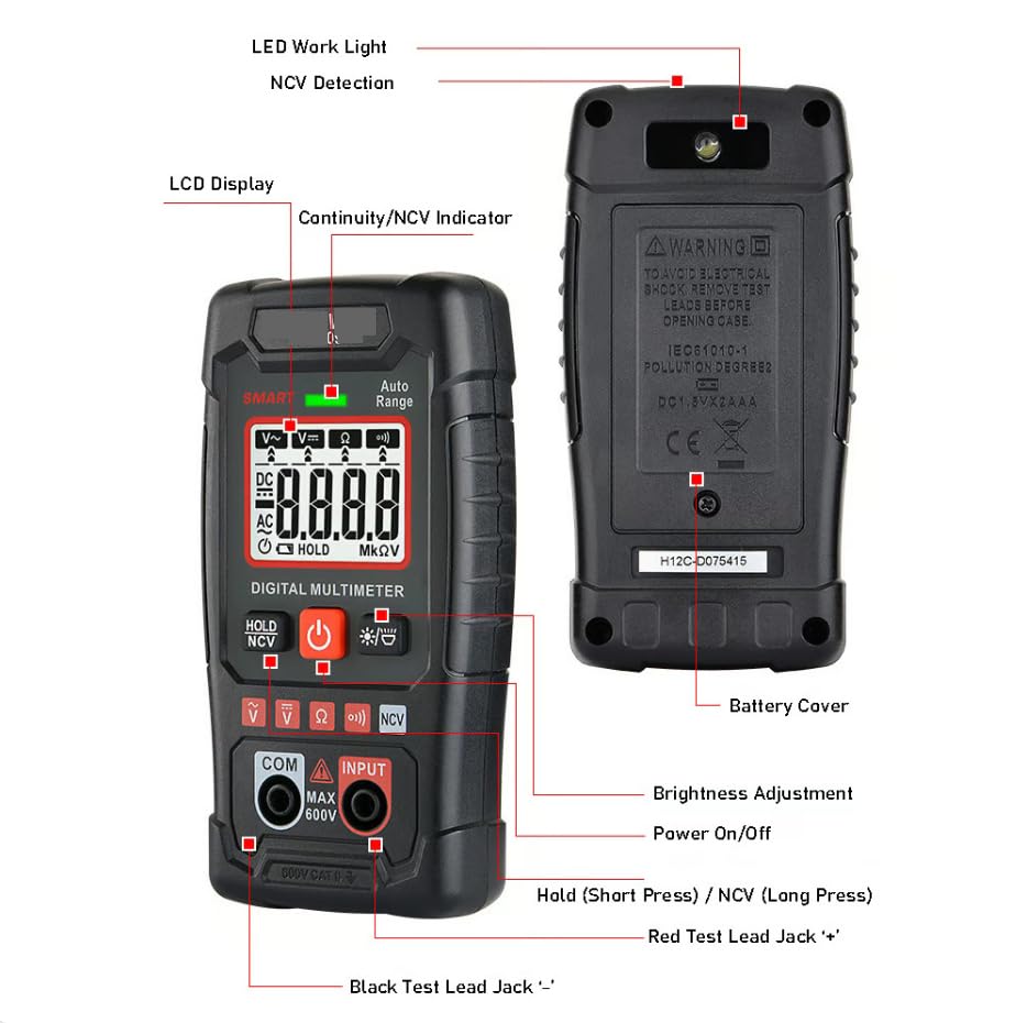 - All-Button Design: Designed for ease of use, our multimeter features an all-button interface (no switch), allowing for quick and easy one-handed operation.