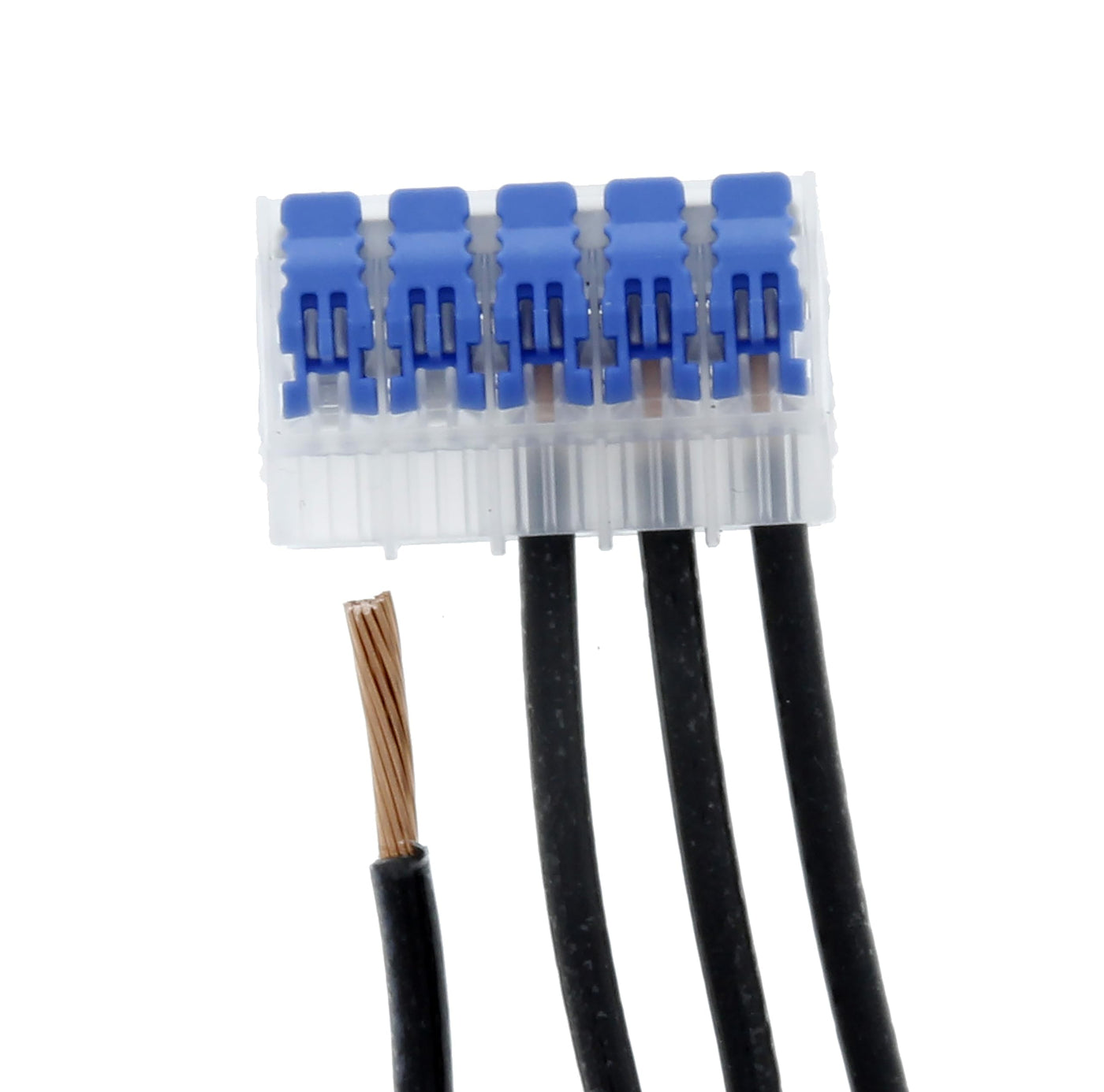 Lever five port wire connectors provide the perfect solution for joining solid and stranded wires. These versatile connectors have a compact design and take up minimal room in junction boxes and enclosures. Bag of 10 five port connectors.