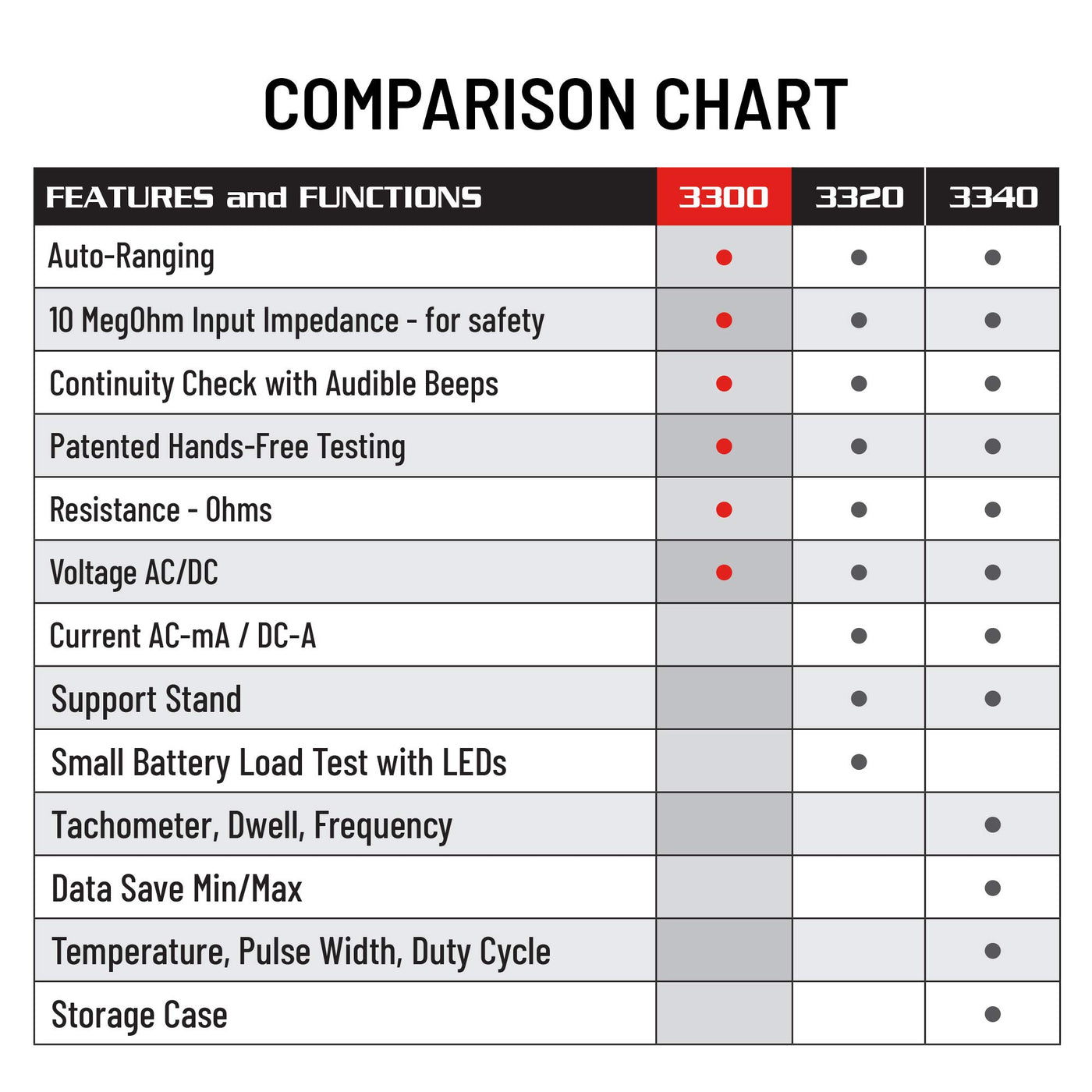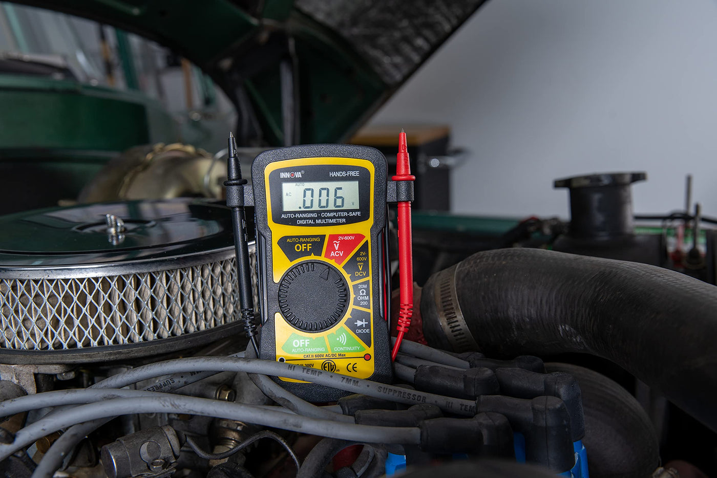 The INNOVA 3300 is a Hands-free Digital Multimeter designed to safely and accurately trouble shoot a variety of automotive and household electrical problems. This entry level multimeter features a 10 MegOhm circuitry to prevent damage to sensitive automotive electronics. It includes test lead holders for hands-free testing as well as easy to read instructions in English, French and Spanish.