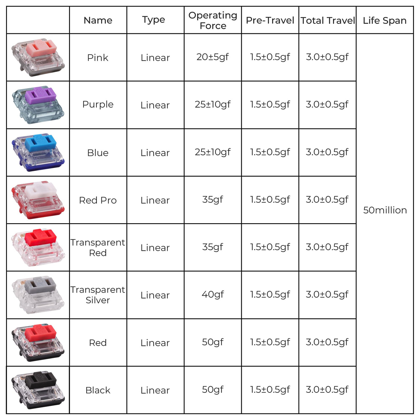 - Durability and Longevity Kailh PG1350 Choc V1Switches are engineered for long lasting performance, with an estimated lifespan of approximately 50 million keystrokes based on rigorous laboratory durability tests.