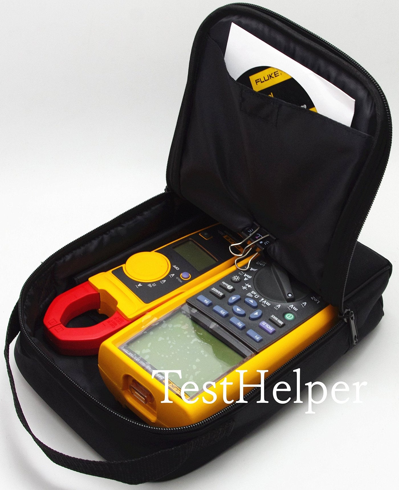 Feature: This is a brand new carrying case for big size digital multimeters,You can store two meter at the same case,Two pockets used to store small accessories Material: black-Polyester ,yellow-PU Colour: Black+yellow Dimensions: Roughly 240mm x 180mm x 60mm(bottom)~75mm(top) . Roughly 9.45in7.08in2.36in(bottom)~2.95in(top) Roughly 0.79ft0.59ft0.19ft(bottom)~0.25ft(top) The 2 compartments are roughly 20mm and 50mm thick. Package Including: 1 x Soft case KCH20 Brand: TestHelper