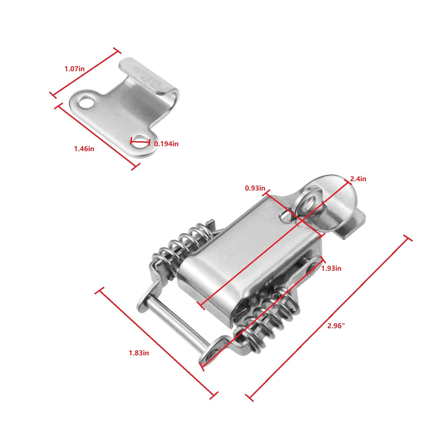 Product Name: LC LICTOP Compression Spring Loaded Toggle Latch Lock 3 Inch 6Pcs 304 Stainless Steel Construction: Built to withstand harsh environments, this latch lock is resistant to rust, corrosion, and wear, ensuring long lasting performance even in outdoor or industrial settings Double Spring Mechanism: The dual spring design provides enhanced tension and reliability, ensuring a secure and tight hold every time, even under heavy loads or frequent use Wide Application: Perfect for toolboxes, chest cases, suitcases, chassis, and luggage, this latch lock is a universal solution for securing a wide range of containers and equipment Easy Installation: Designed for hassle free setup, the latch lock can be quickly mounted on various surfaces without the need for specialized tools or expertise Value Pack of 6: Offering a set of six latches provides excellent value for money, ensuring you have enough units for multiple projects or replacements, saving time and effort in the long run About the Manual Measurement: Please notice that due to the possibility of differences between manual measurement and mass production, there may be a slight error of 0.04-0.08 inch in the size information provided for reference