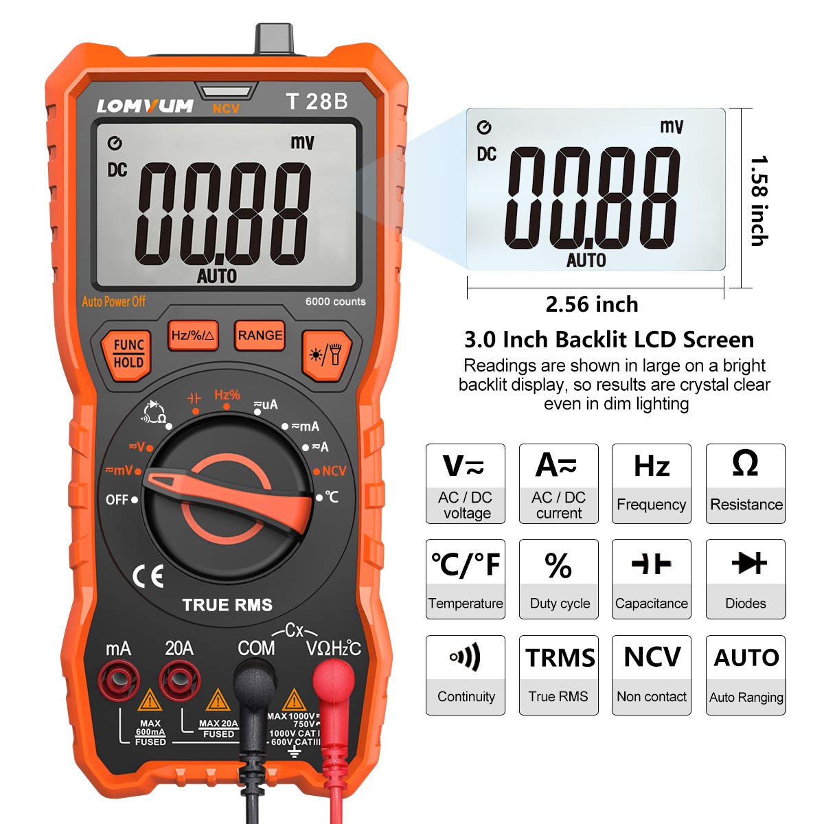- PACKAGE - Lomvum Auto-Ranging Digital Multimeter , 4 X 1.5V AAA Battery, English User's Manual, Test Leads, K-type thermocouple, 24-Month Warranty. Please be assured to purchase T Lomvum Auto-Ranging Digital Multimeter
