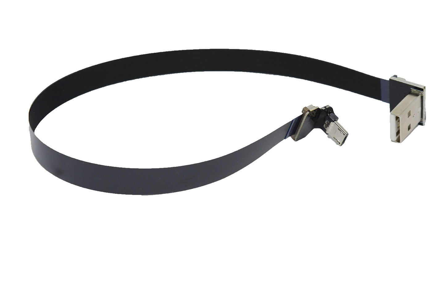 - Micro USB male plug angled up to standard USB A male 90 degree plug(angled up or down). Slim Thin and Flexible ribbon USB cable 90 degree up .Good for gimbals rigs and drone build .