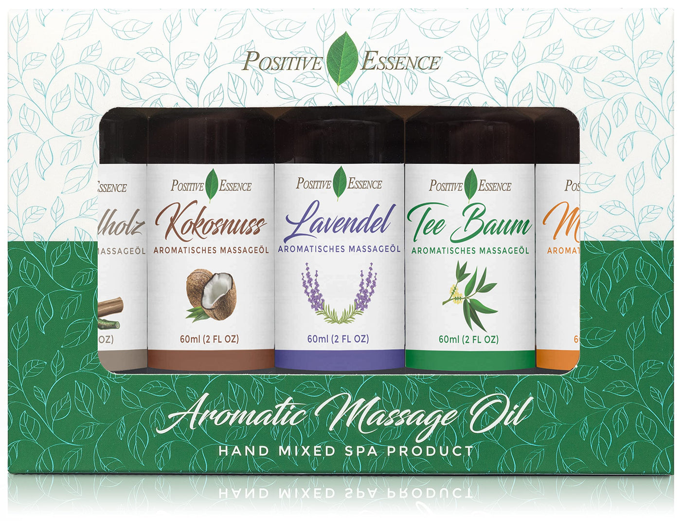 - Five Enticing Scents: Coconut, Tea Tree, Mandarin, Sandalwood, and Lavender Massage Oil. Each body oil scent is carefully selected for its calming properties.