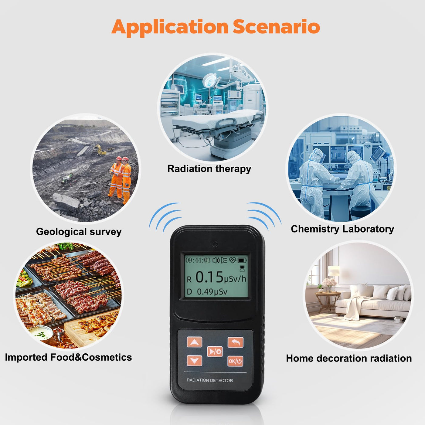 - Wide application: the radioactivity dosimeter can detect nuclear radiation, , and X-rays and can be easily used in environments with ionising radiation. This nuclear radiation detector is widely used in DIY radiation monitoring, nuclear power plants, industry, radiology laboratories, goods control in import and export fields, geological investigations and more. It is your essential monitoring and protection partner in nuclear radiation environments.
