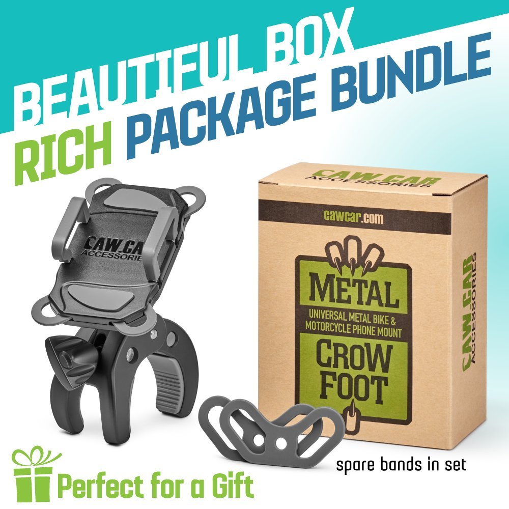 Searching for a handy good quality bike mount for your phone, but you do not feel like spending your time choosing the best option? You don't have to, we have done it for you! We have thoroughly studied all bicycle and motorcycle phone mounts on the market, carefully looked through all users' reviews and complaints and developed our own CAW.CAR Accessories Extra-Thought-Out Universal CrowFoot Handlebar Phone Mount! HERE ARE SOME COOL FEATURES OF OUR BIKE MOUNT: Works with all phones even in protective cases! From small iPhone 5 to huge iPhone 12 Pro Max; Rock-solid Metal CrowFoot clip securely fits all tubular handlebars and reduces trembling by absorbing bike vibrations; The ball joint allows you to tilt/rotate your phone freely and firmly fix it in any desired position; Specially designed phone clip with built-in slings securely holds your phone while allowing to mount/unmount the phone in seconds; The mount keeps your phone handy and allows you to ride smoothly. Enjoy comfortable and safe rides with your phone at hand! Read more So, what are you waiting for? As you see, we have thought everything out, our bike phone holder is just what you need! Enhance your riding comfort and consider getting a couple of items to have a discount... one for you and one as a gift for a friend! Current product Metal CAW.CAR Bike Mount PandaHug Mount CrabGrab Mount DinoGrip Mount Phone rotation ✓ ✓ ✓ ✓ ✓ Phone angle adjustment ✓ ✓ Low profile model - rotation only ✓ ✓ Plus size phones combinability ✓ ✓ ✓ ✓ ✓ Compatibility All phones even in cases All phones even in cases All phones even in cases All phones even in cases or with a PopSocket All phones even in cases