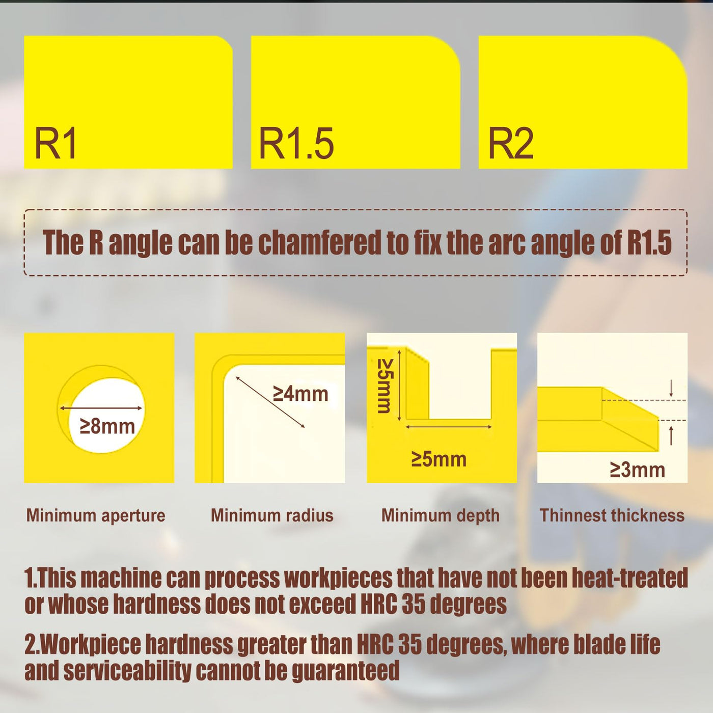 - Purpose: The currently thinnest nut safety bearing is used, which can be chamfered in the narrowest and flatest space, suitable for different angles, such as straight edge chamfers, inner and outer round hole chamfers, irregular chamfering, the keyway polygonal chamfer. Used for metal trimming arch corner R side.