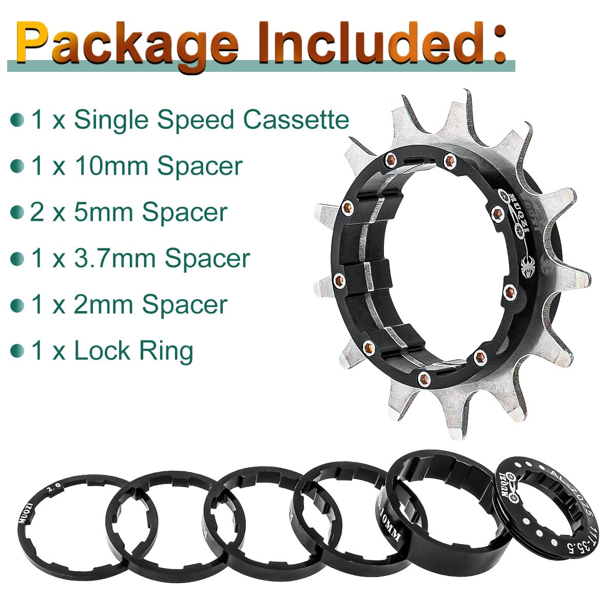 - Package Includes:1 x 10mm spacer, 2 x 5mm spacer, 1 x 3.7mm spacer, 1 x 2mm spacer, 1 x single speed cassette, 1 x lock ring. In addition, it comes with 2 PCS cable sleeves for cable housing protectors.