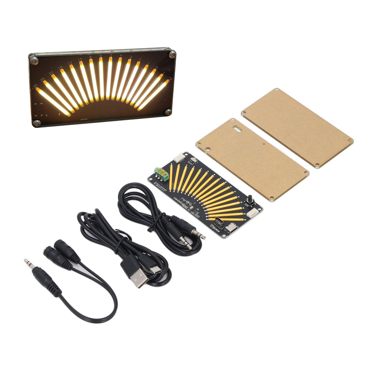 1. Advanced 16 Bit Indicator System: The music level meter features a 16 bit indicator setup that can be controlled via voice input. It also supports sound signal line input with a ensuring professional accuracy without manual intervention. 2. Adjustable Light Speed Control: Equipped with adjustable light speed control, this VU meter indicator ensures precise sound output, providing an aesthetically pleasing visual and auditory experience. 3. Memory Saving Functionality: All functional settings on the music level meter come with memory saving features, allowing for long term use without losing your configurations. 4. Enhanced Sound Capability: Designed to enhance sound with a signal range of -30dB to 2dB, this meter fits seamlessly into home sound systems, offering a modern feeling. 5. Acrylic Crafted Design: Crafted from acrylic, the music level meter serves as both a practical addition to sound equipment and a stylish collectible for audiophiles, merging functionality with aesthetics. Specification: Item Type: Music Level Meter Material: Acrylic LED Emitting Length: 24mm/0.94in Signal Range: -30dB to 2dB Power Voltage: DC 5V 1A Input: 3.5mm How to Use: Install and use packing list: 1 x Music Level Meter Board 2 x Acrylic Boards 2 x Lamp Wires 1 x Wrench 9 x Screws 5 x Screw Bolts 1 x Ribbon Cable 1 x Washer 1 x Supply Cord 1 x Sound Cable 1 x Adapter Cable